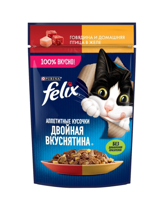 Влажный корм, "Felix", Аппетитные кусочки. Двойная Вкуснятина, говядина и домашняя птица в желе, 75г 6 шт