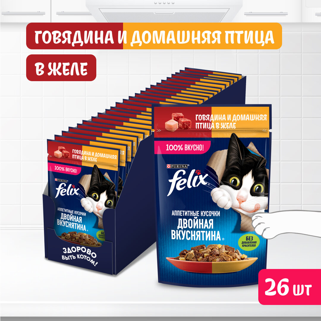 Купить Влажный корм Felix Аппетитные кусочки, Двойная вкуснятина для взрослых кошек, с говядиной и домашней птицей, в желе 26х75 г