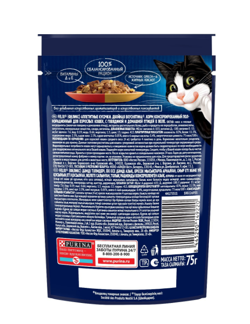 | Дозировка | для взрослой кошки среднего веса (4 кг) требуется примерно 3-4 пакетика с влажным кормом в день; кормление желательно разделить минимум на два приема |