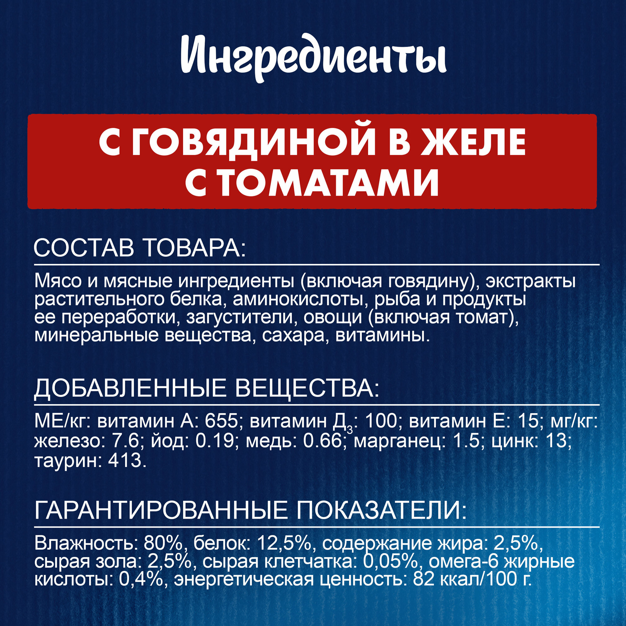 | Состав | мясо и продукты переработки мяса (из которых говядина 4%), экстракт растительного белка, рыба и рыбные субпродукты, овощи (томаты 4% в желе), минеральные вещества, сахара, красители, витамины |