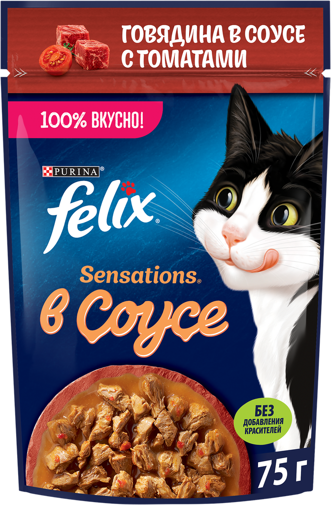 Купить Корм влажный для взрослых кошек FELIX Sensations Говядина в соусе с томатами, 75г