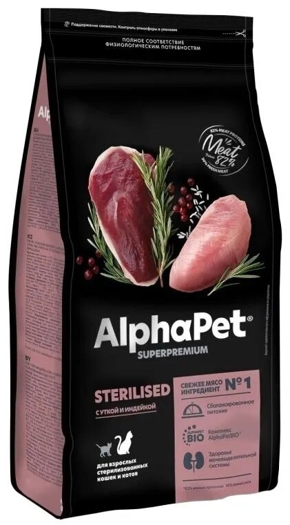 Сухой корм Alphapet Superpremium для взрослых стерилизованных кошек с уткой и индейкой, 1,5 кг