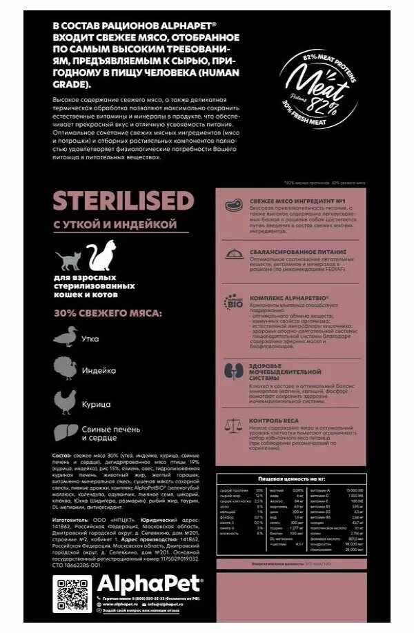 Корм AlphaPet Superpremium для стерилизованных кошек, c уткой и индейкой, 400 г