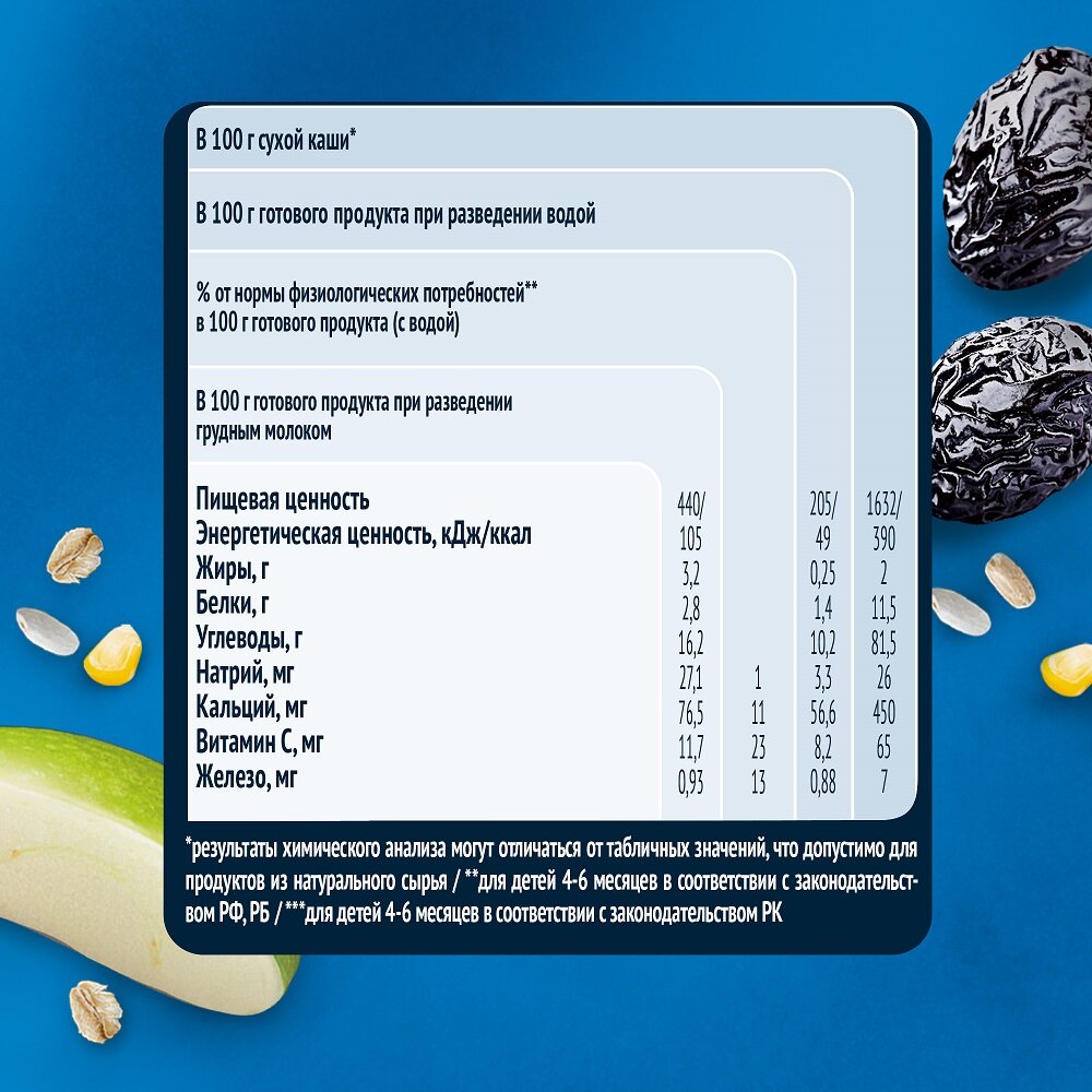 | Состав | мука (пшеничная (80,7%) (содержит глютен), гречневая (4,2%), рисовая (4,2%), кукурузная (2,8%), овсяная (2,8%) (содержит глютен)), хлопья яблока (2%), хлопья чернослива (2%), минеральные вещества (кальция карбонат, железа(II) фумарат), бифидобактерии не менее 1х10^6 КОЕ/г. Продукт может содержать молоко. Продукт упакован в модифицированной атмосфере с азотом. |