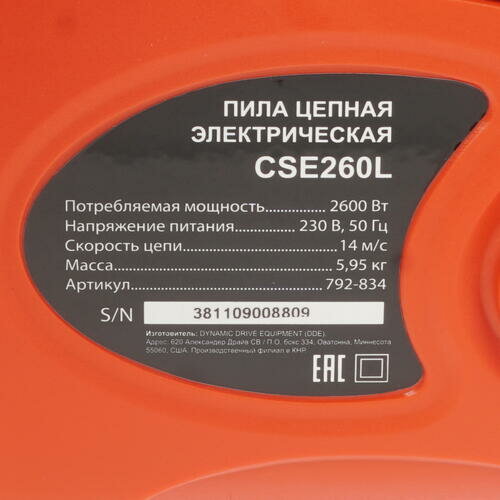 DDE Пила цепная электрическая 792-834 CSE260L 18" 2,6 кВт 45 см 3/8PM-62-1,3 SDS 792-834