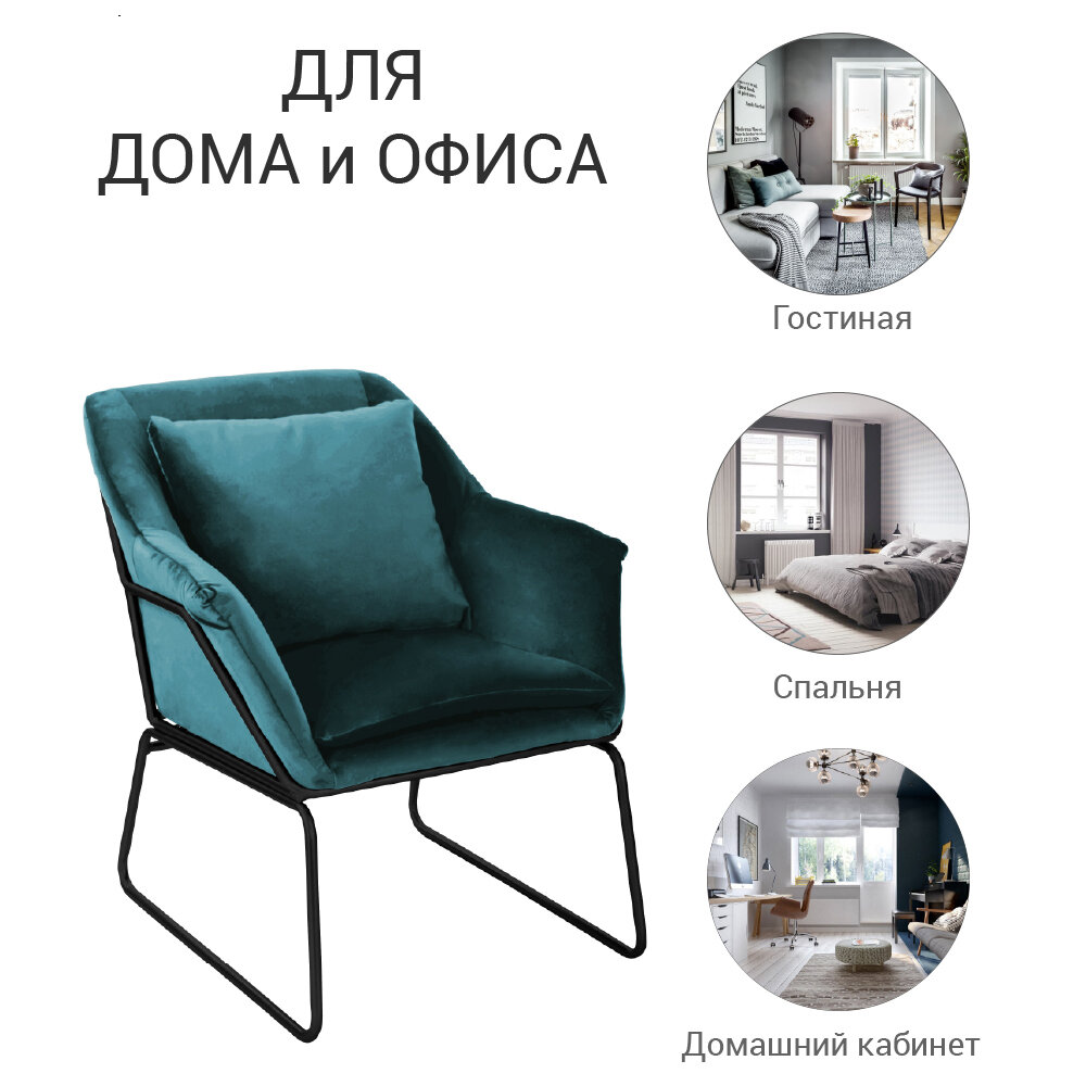 Кресло с подушкой мягкое велюр ALEX темно-бирюзовое, для отдыха, на черных металлических ножках, офисное, интерьерное для дома в гостиную и на кухню