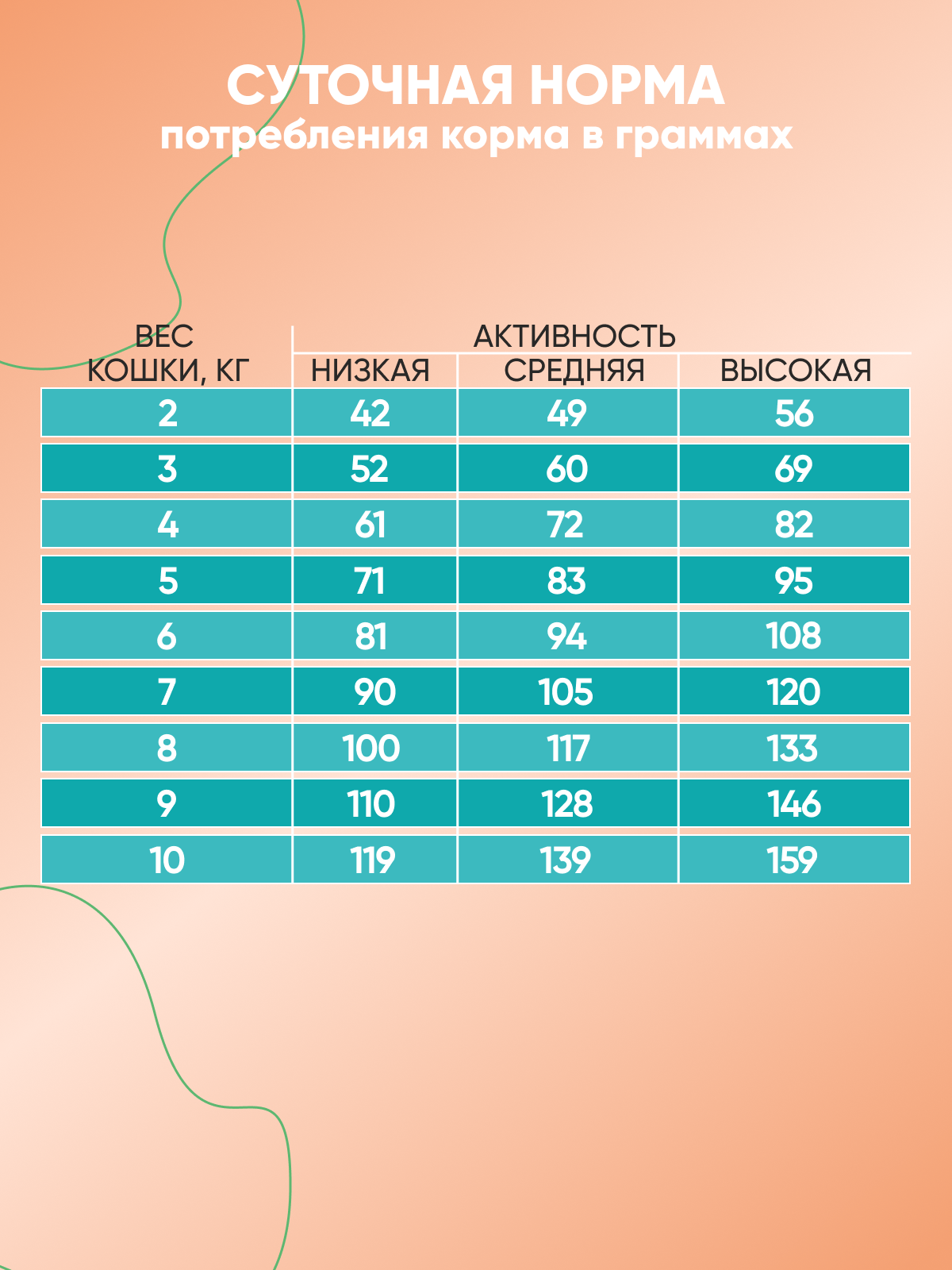 | Дозировка | Суточная корма зависит от веса животного (от 42 г до 159 г). Подробная информация на фото и на упаковке товара. |
