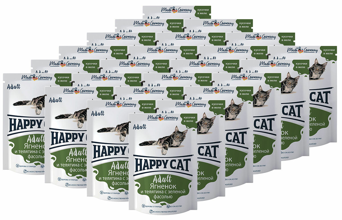 Купить HAPPY CAT для взрослых кошек с ягненком, телятиной и зеленой фасолью в желе 7502307 (100 гр х 24 шт)
