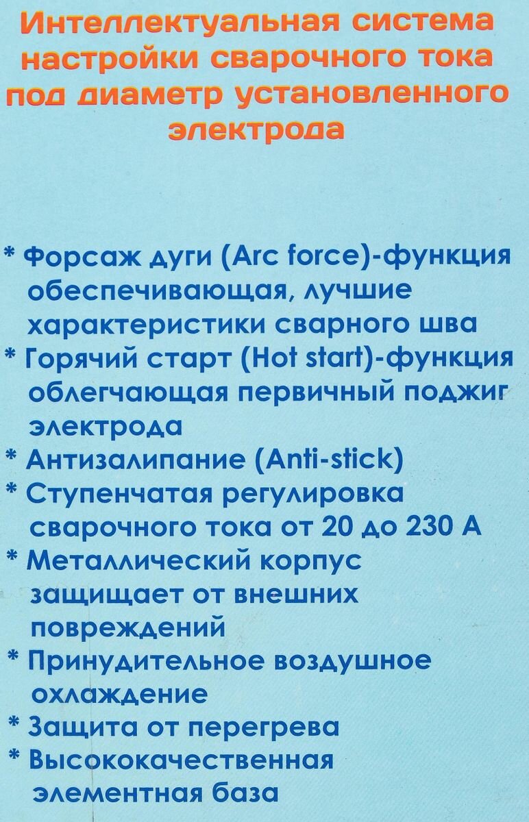 | Дополнительные функции | антиприлипание / горячий старт / форсаж дуги |