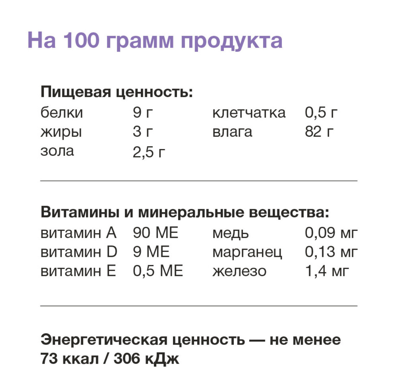 | Витамины | витамин А – 90 МЕ, витамин D – 9 МЕ, витамин Е – 0,5 МЕ |