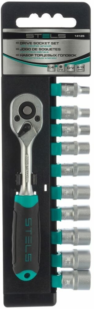 STELS 14125 Набор торцевых гоовок, 1/4, гоовки 4 - 13 мм, с трещот. кючом, CrV, 11 прм. STELS 14125
