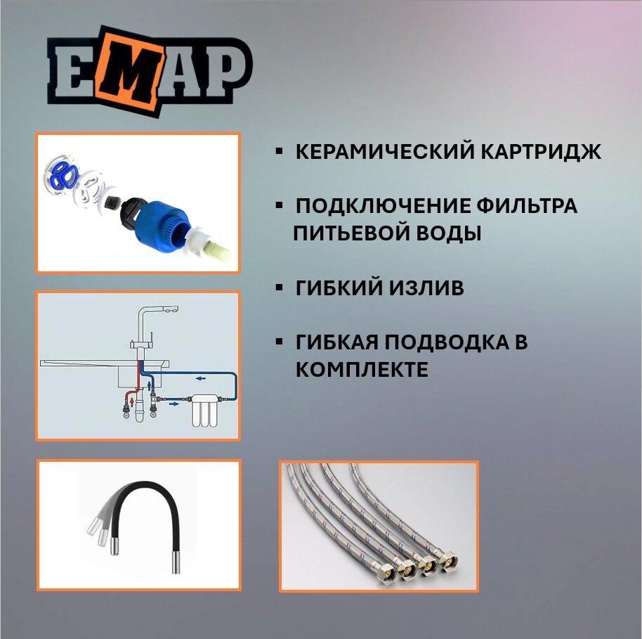 Смеситель для кухни с гибким изливом и подключением фильтра питьевой воды - EMAR 3015