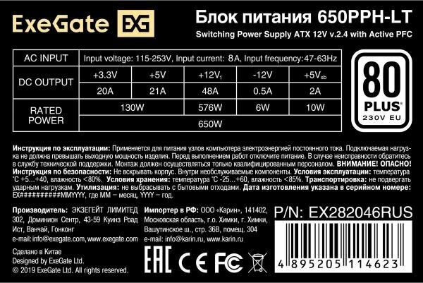 Блок питания 650W ExeGate 80 PLUS® 650PPH-LT-OEM (ATX, APFC, КПД 82% (80 PLUS), 12cm fan, 24pin, 2x(4+4)pin, 2xPCI-E, 6xSATA, 3xIDE, black, RTL) EX282046RUS-OEM
