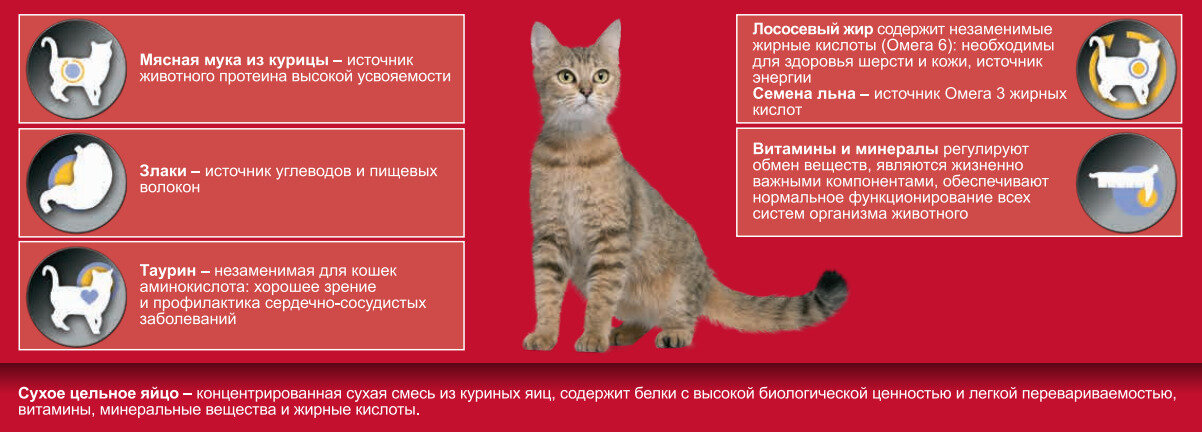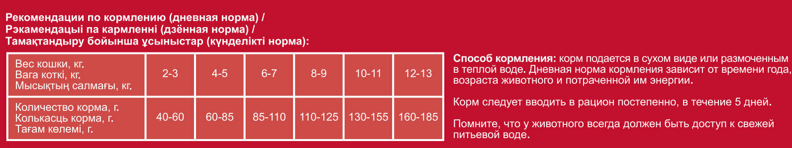 | Витамины | А – 24000 МЕ/кг, D3 – 2000 МЕ/кг, Е – 500 мг/кг, таурин – 1500 мг/кг |