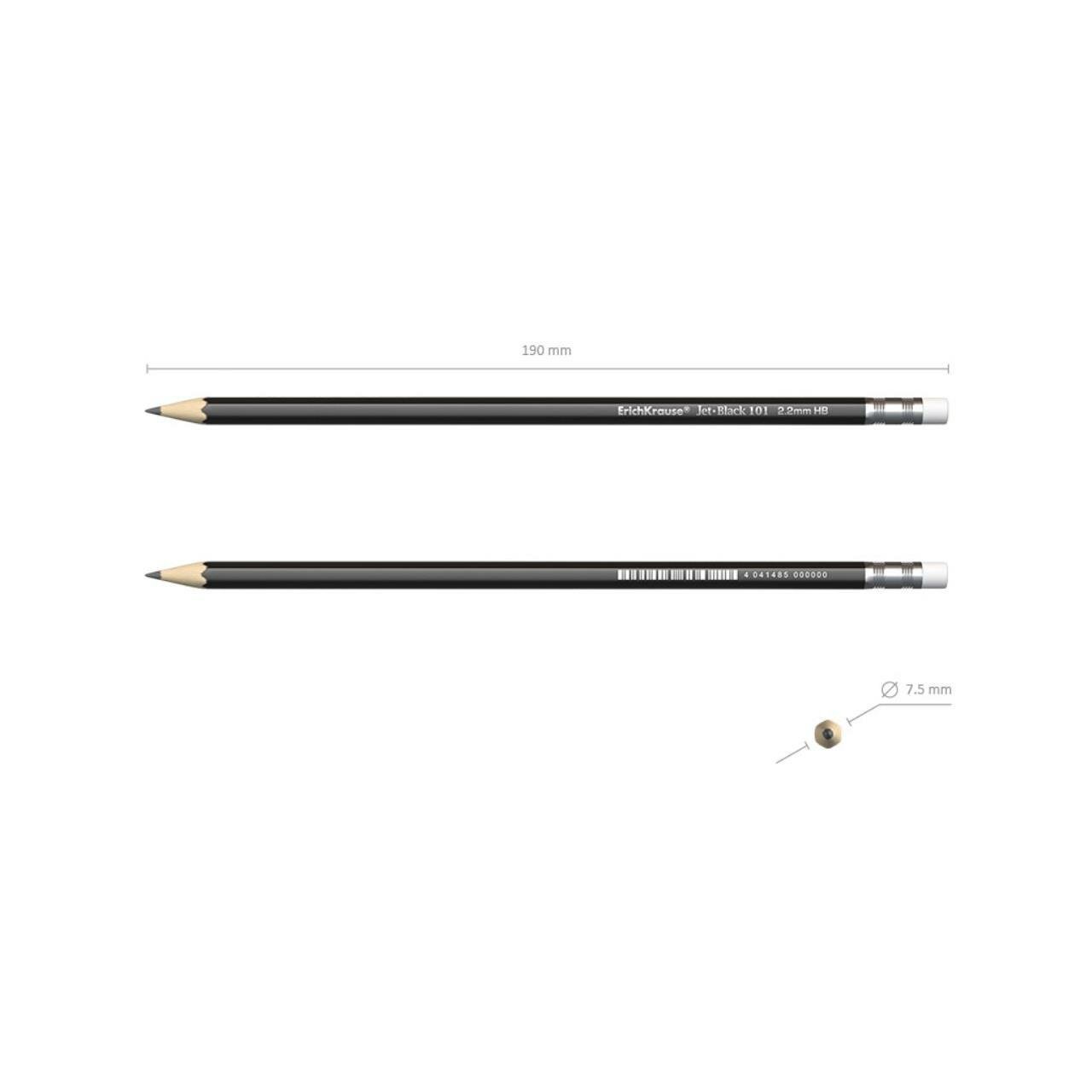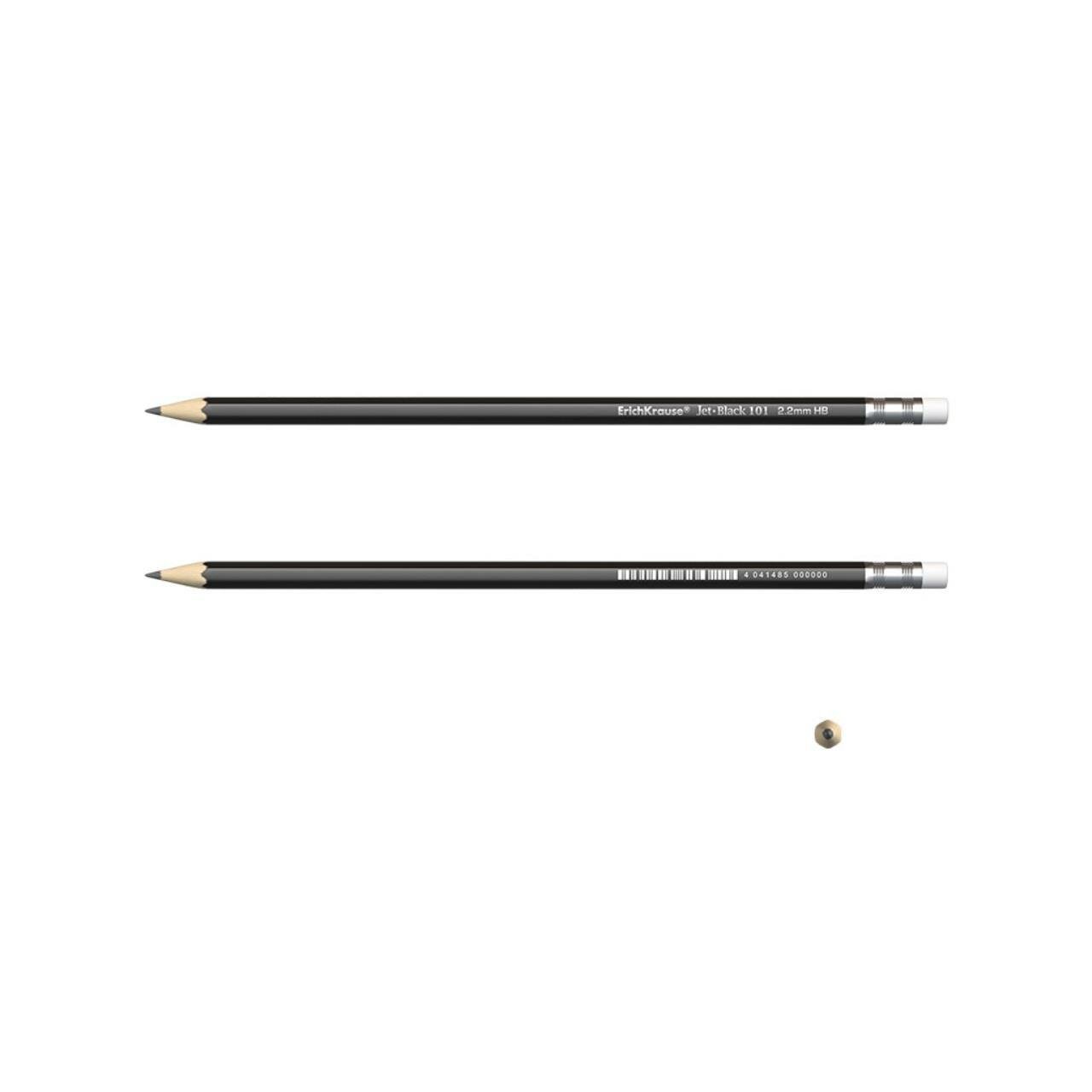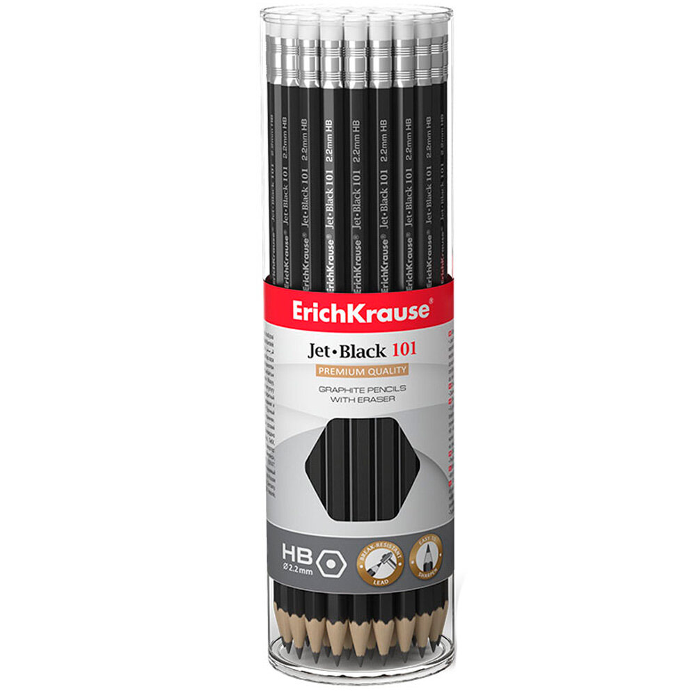 Купить Карандаш чернографитный с ластиком Erich Krause Jet Black 101 HB, грифель d 2.2 мм, шестигранный, из отборной древесины, в тубусе, 42 штуки