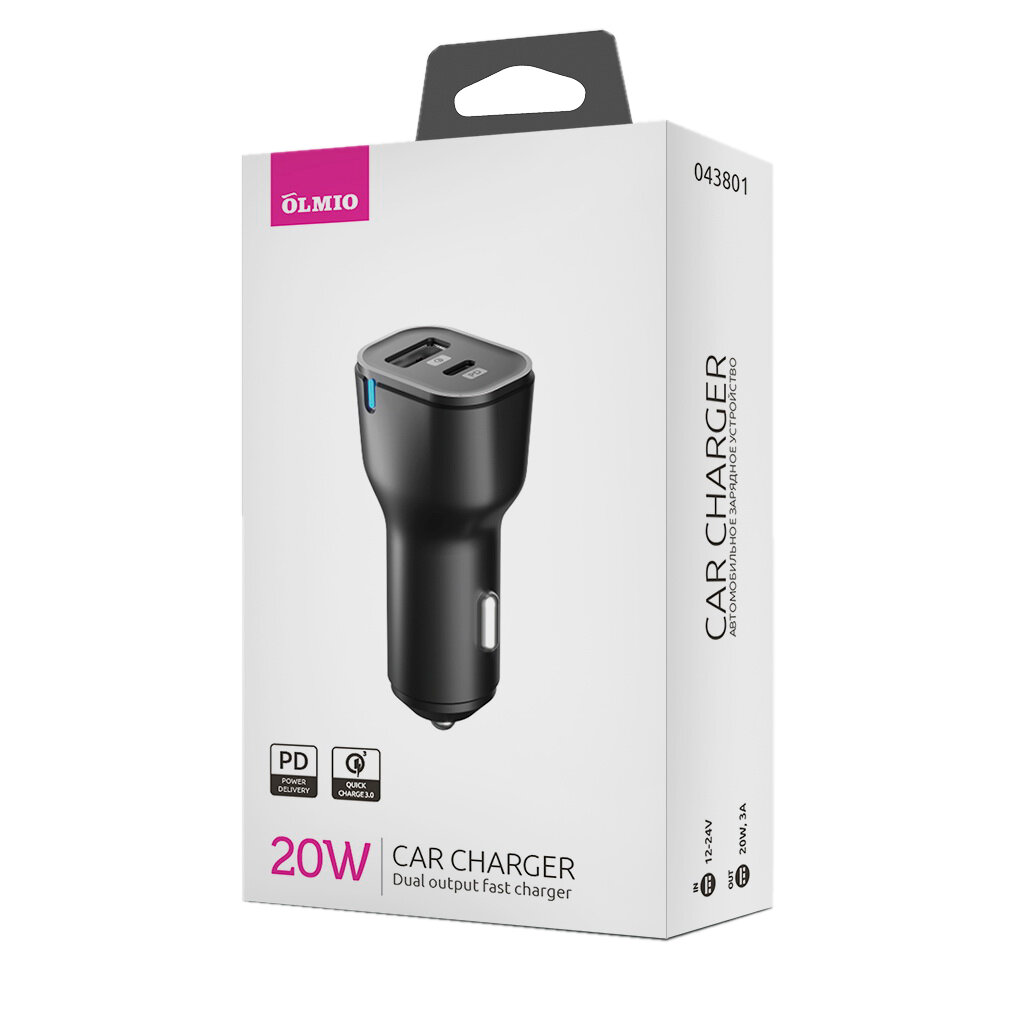 Автомобильное зарядное устройство OLMIO 20W, Type-C +USB, PD, QC, black