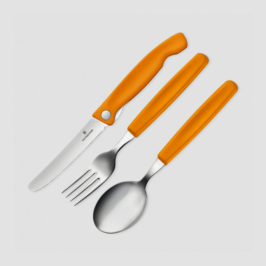 Набор из 3 столовых приборов VICTORINOX Swiss Classic: складной нож для овощей 11 см с волнистой заточкой лезвия, вилка, ложка, нержавеющая сталь / полипропилен, оранжевая рукоять (6.7192.F9)