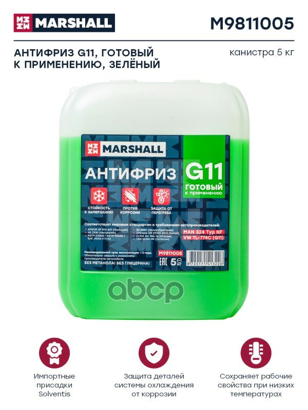 Антифриз Marshall G11, Готовый К Применению, Зеленый, Канистра 5 Кг. (M9811005) MARSHALL арт. M9811005 интересное: