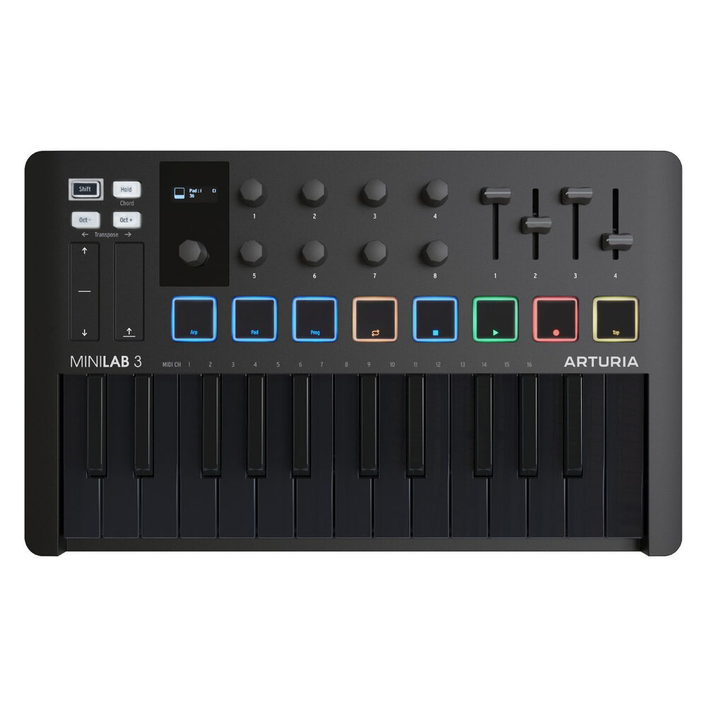 Arturia MiniLAB 3 Deep Black - 25 клавишная MIDI-клавиатура - пэд-контроллер, 9 регуляторов, 8 RGB пэдов, 8 фейдеров, дисплей, сенсорные регуляторы Pitch/Modulation, MIDI-выход, 1/4" Jack вход педали, режим Chord, арпеджиатор, USB-C, ПО