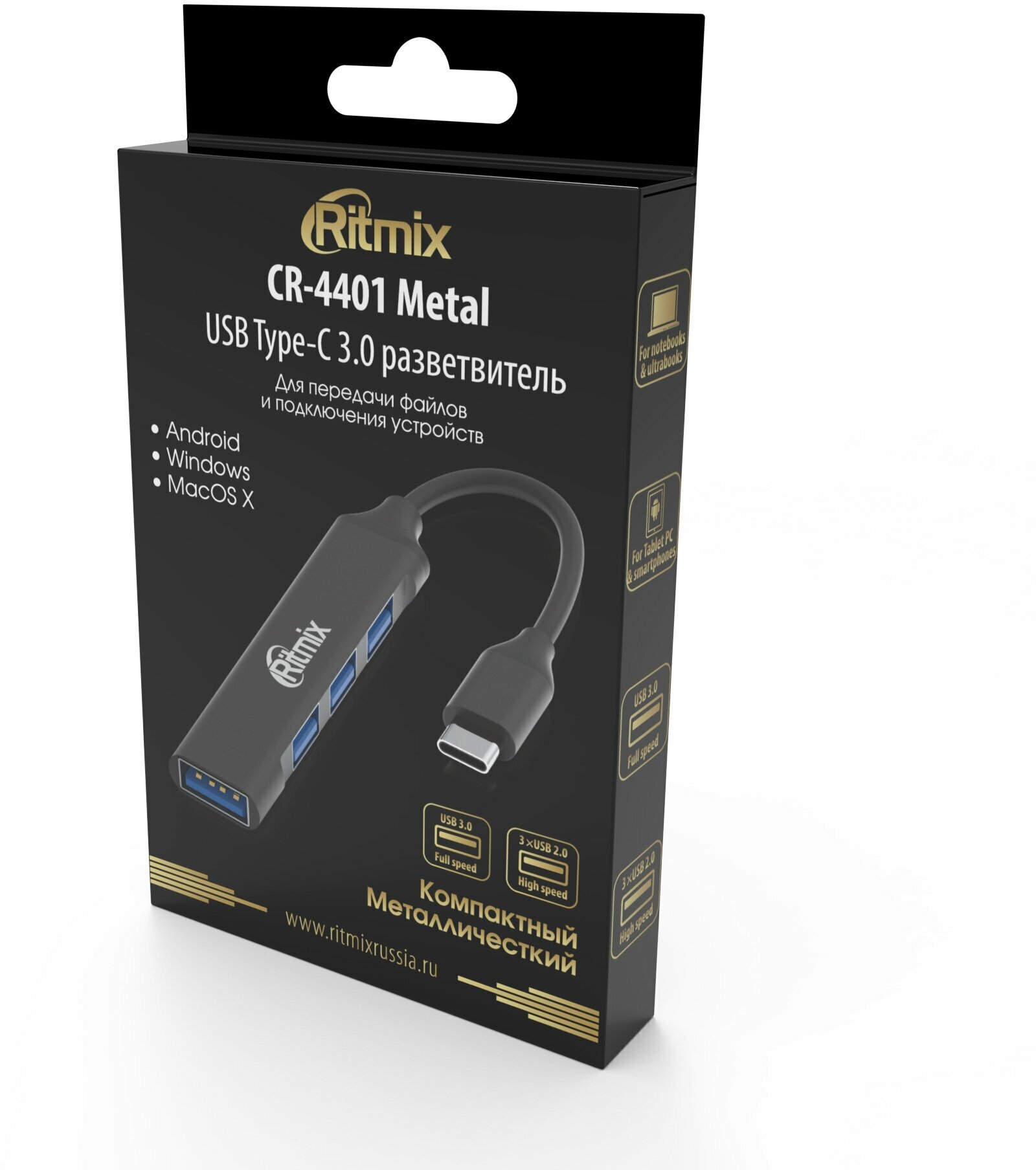 Хаб RITMIX CR-4401 Metal,TypeC на USB3.0;1xUSB3.0+3xUSB 2.0 ,каб.9.5см,корп из алюм.сплав