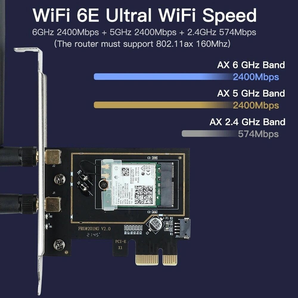 Полный no name. Чип Intel. Посмотрим, как поведёт себя в будущем. Драйвера без проблем установил через эту программу Intel® Driver & Support Assistant. Как писали в других отзывах, требуется на материнке свободный разъем JUSB, так он для bluetooth требуется всегда и это не недостаток. На скрине где 941 это через кабель, 564 это адаптер на 5 Ггц, 81 это адаптер на 2.4 Ггц, так что на 5 Ггц даже до кабельного недотягивает почти в два раза, хотя заявлено до 2402 Мбит/с (5 ГГц) + 574 Мбит/с (2,4 ГГц). До роутера 2 метра без препятствий.