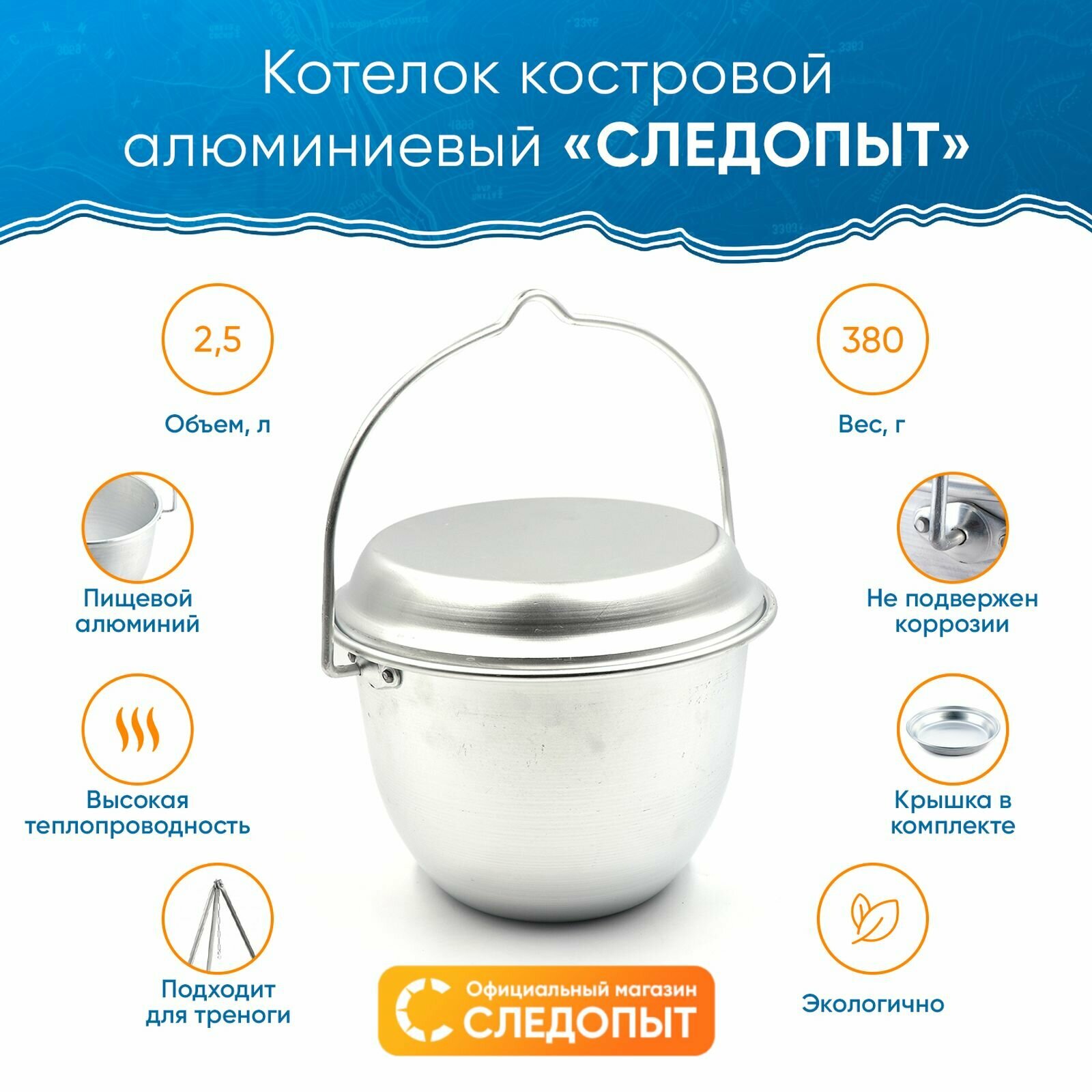 СохранитьКотелок туристический 2,5 л "следопыт" , Казан костровой алюминиевый , Ковш для похода , Котел с крышкой - салатницей , Казанок для ухи , Посуда походная интересное:
