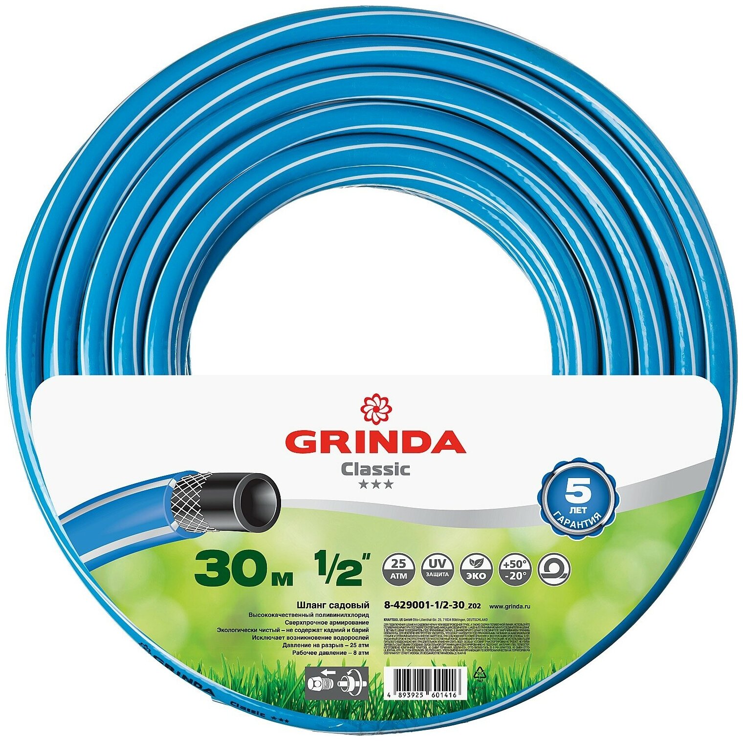 GRINDA Ø 1/2" х 30 м, 25 атм., 3-х слойный, армированный, шланг садовый CLASSIC 8-429001-1/2-30_z02