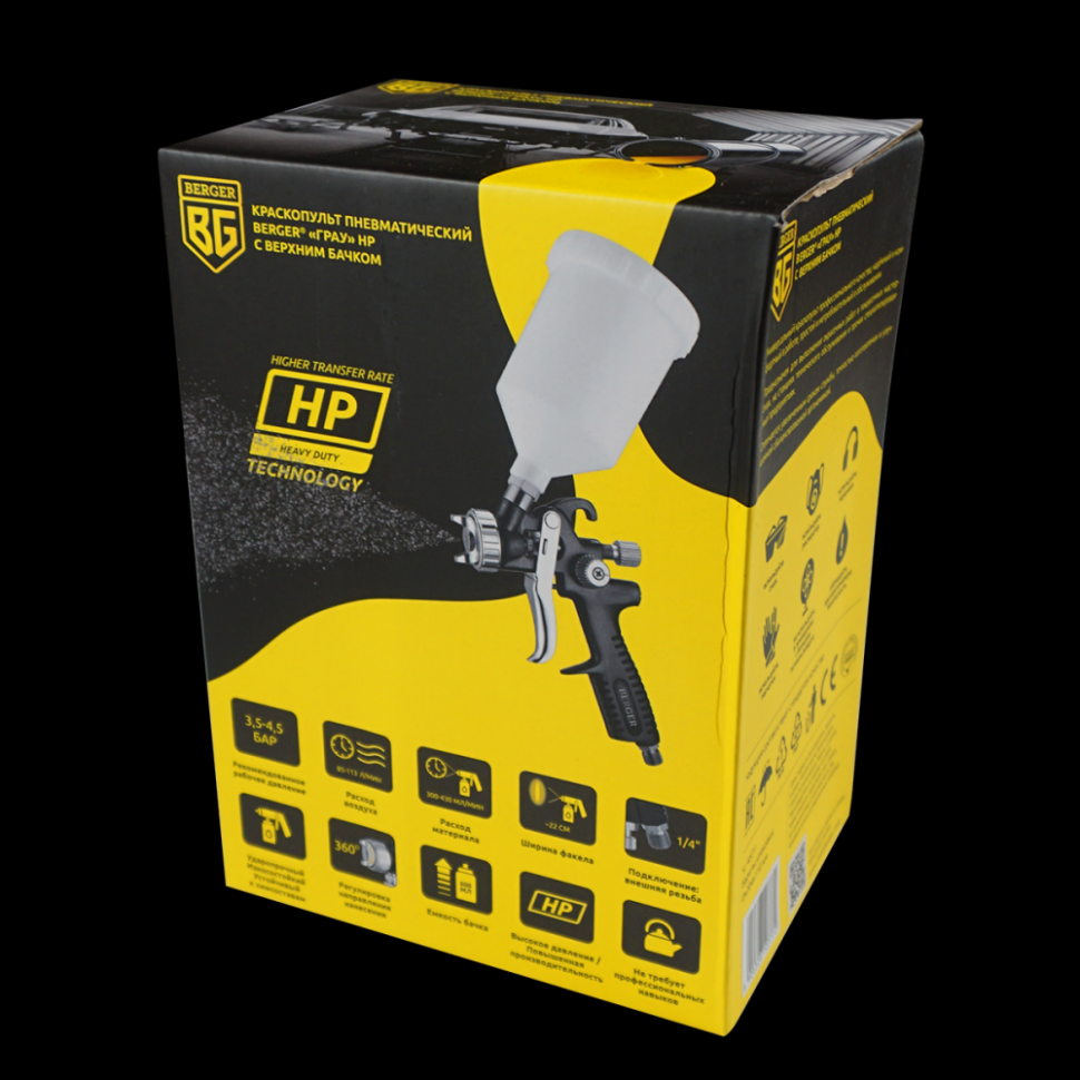 Краскопульт пневматический BERGER «грау» HP 2.0 мм верхний бачок BG1370