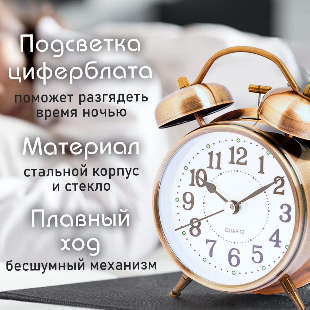 СохранитьЧасы будильник настольные классические D-10 см медный цвет Эврика детские, взрослые, подарочные мужские на 23 февраля, женщине на 8 марта, ребенку, на стол, в спальню интересное: