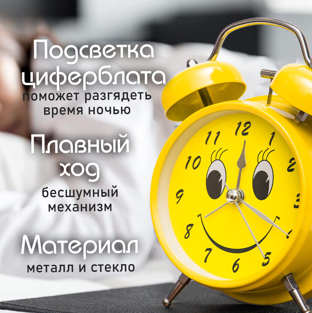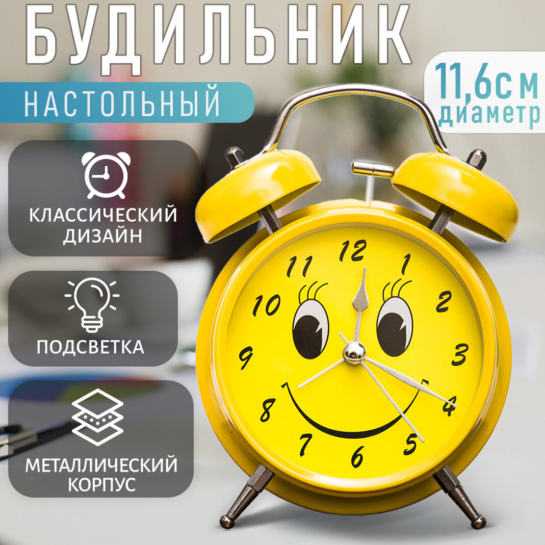 Купить Часы будильник Смайл желтый D -11, 6 см Эврика, будильник детский, часы для ребенка, подарок мальчику на 23 февраля, девочке 8 марта