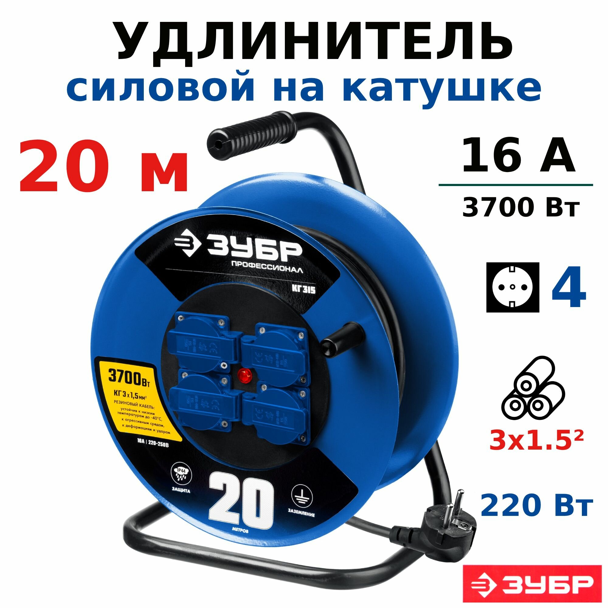 ЗУБР Удлинитель на катушке КГ 315, 20 м, 3700 Вт, 4 гнезда, IP44, КГ 3х1,5 кв мм, ЗУБР Профессионал, ( 55080-20 )