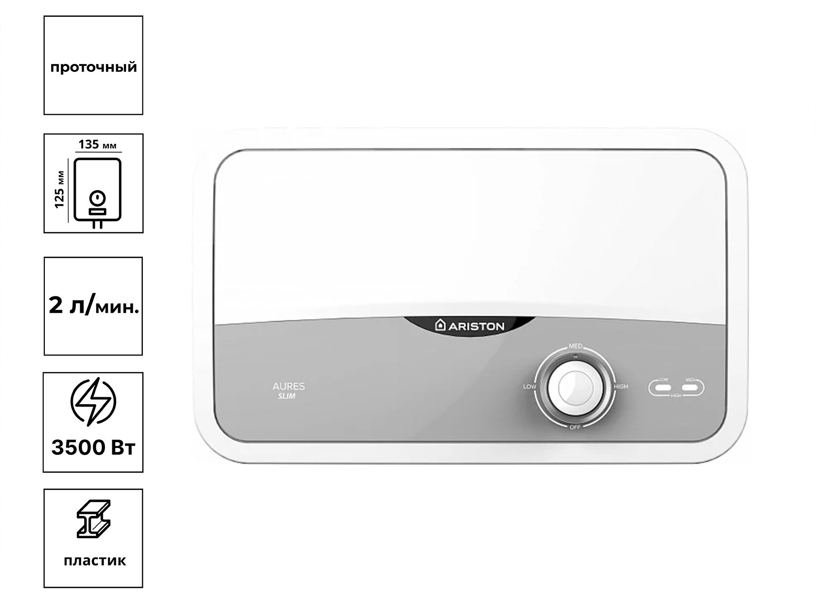 Проточный электрический водонагреватель Ariston Aures S 3.5 COM PL, душ+кран, белый