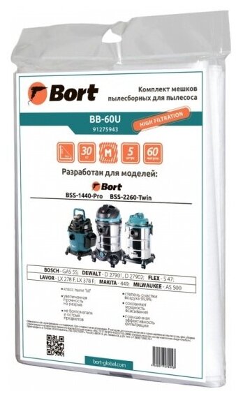 Мешки для пылесоса Bort Bb-60u (для пылесосов Bort BSS-1440-Pro и Bss-2260-twin), 5 штук . интересное: