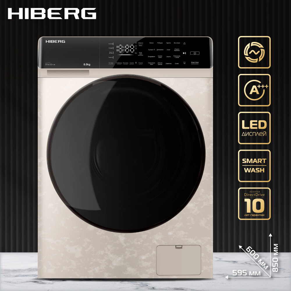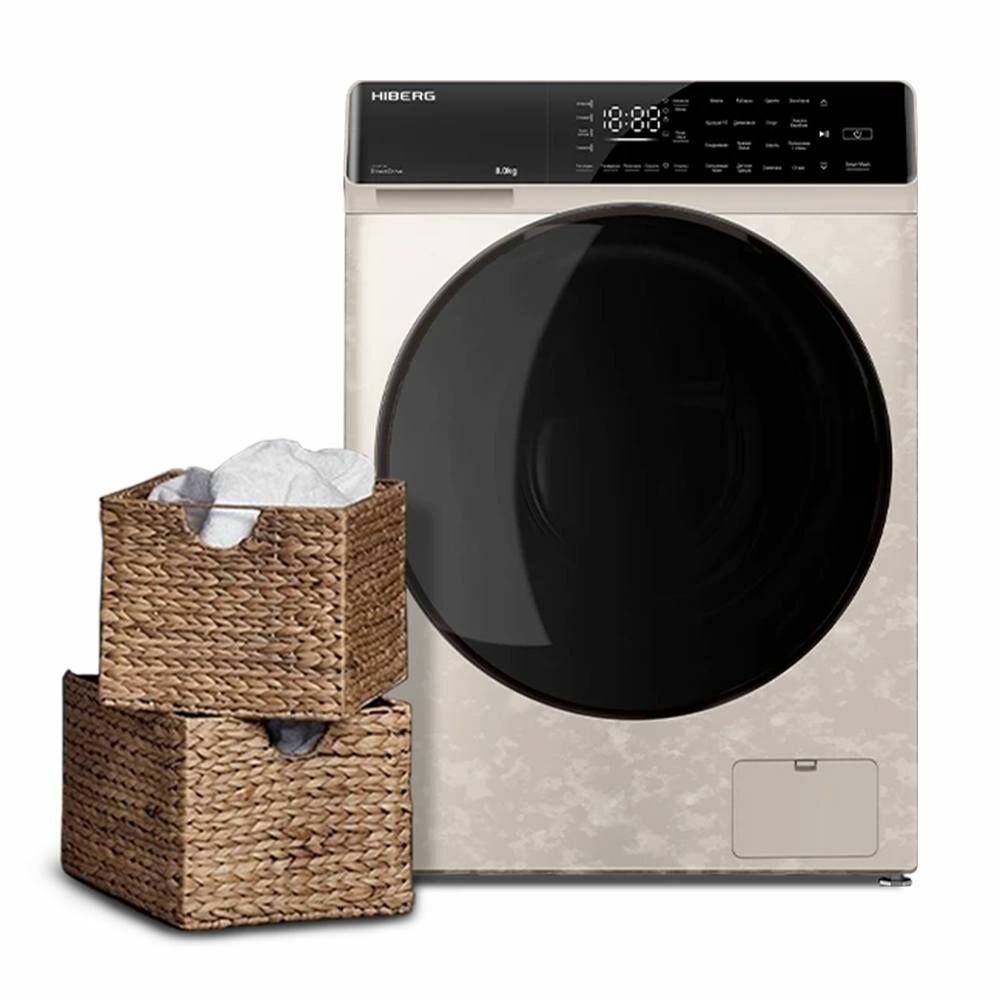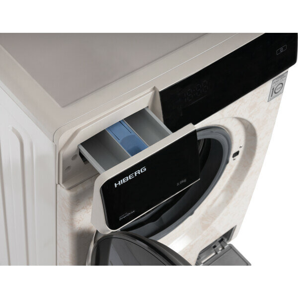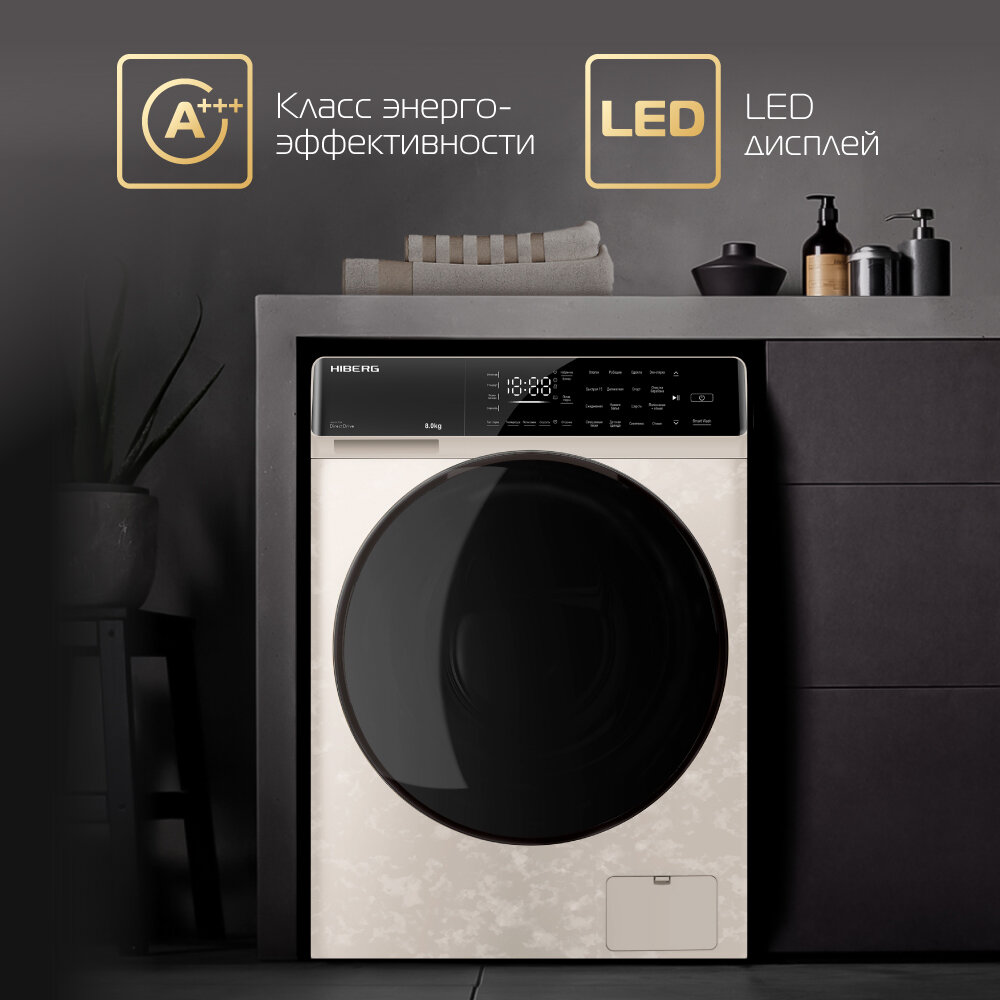 Стиральная машина HIBERG i-DDQ9 - 812 Ym, инверторная, 8 кг загрузка, 1200 об/мин, 16 программ, Smart wash, таймер, бежевый мрамор