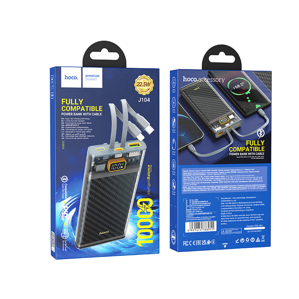 Внешний аккумулятор повербанк Power bank HOCO J104 10000mAh PD 22.5W+ QC3.0 с дисплеем серый