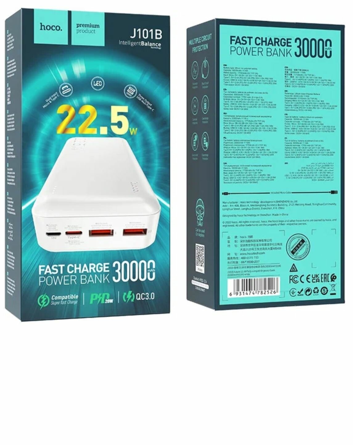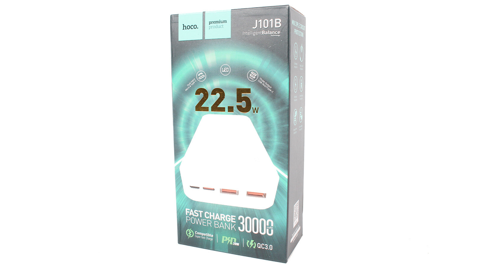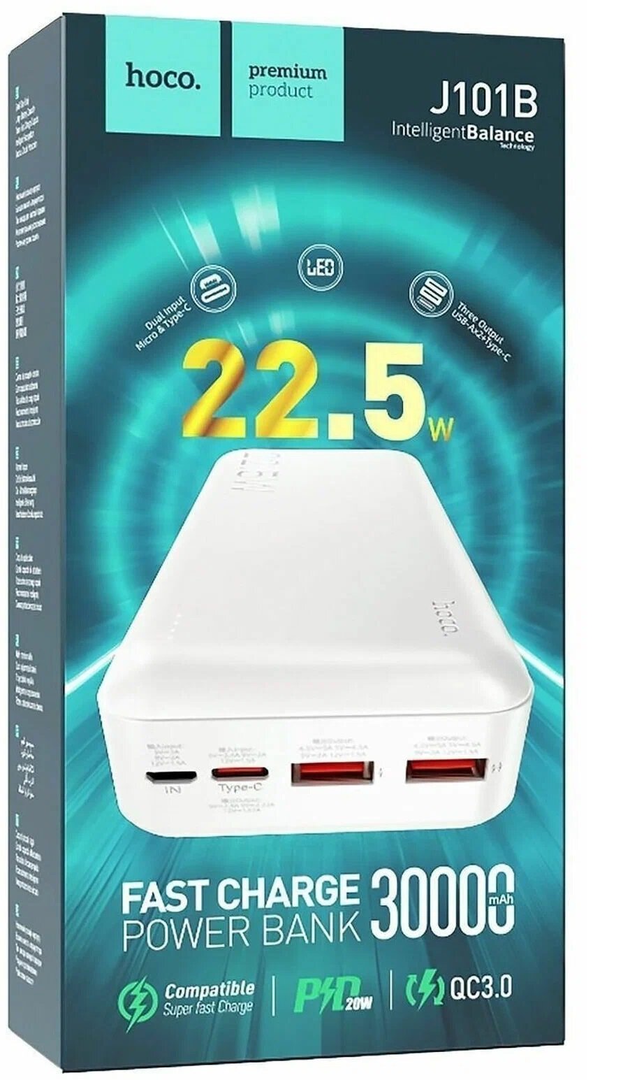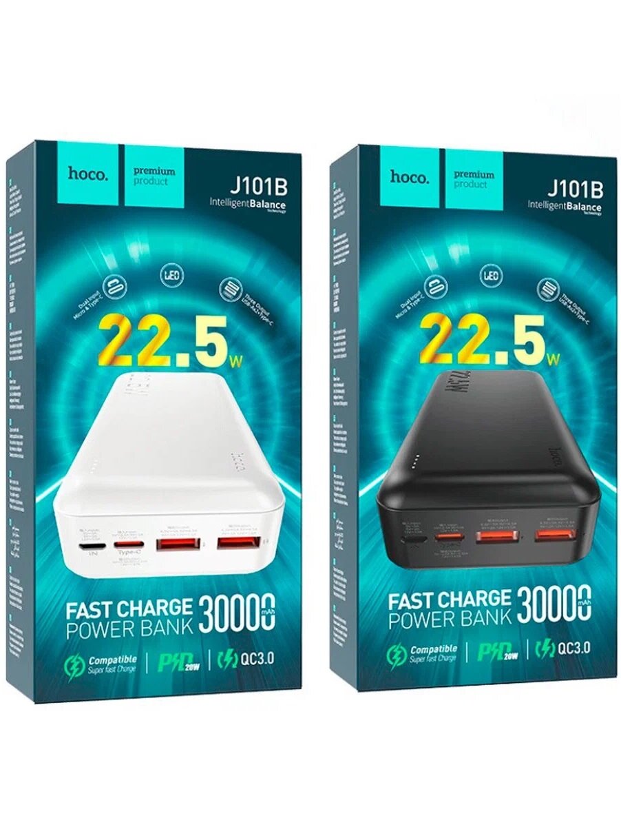 Универсальный Доп. Аккумулятор 30000mAh, J101B, HOCO, выход: 2 USB (22.5W)+1 PD (20W), белый