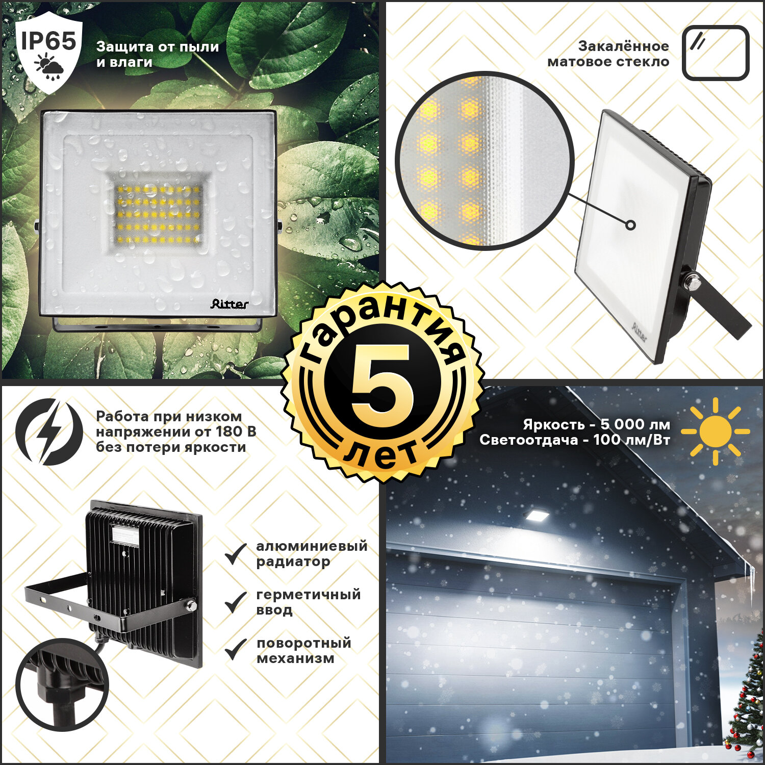 Прожектор Ritter светодиодный PROFI 230В 50 Вт 6500К 5000Лм IP65 черный 53408 6 интересное: