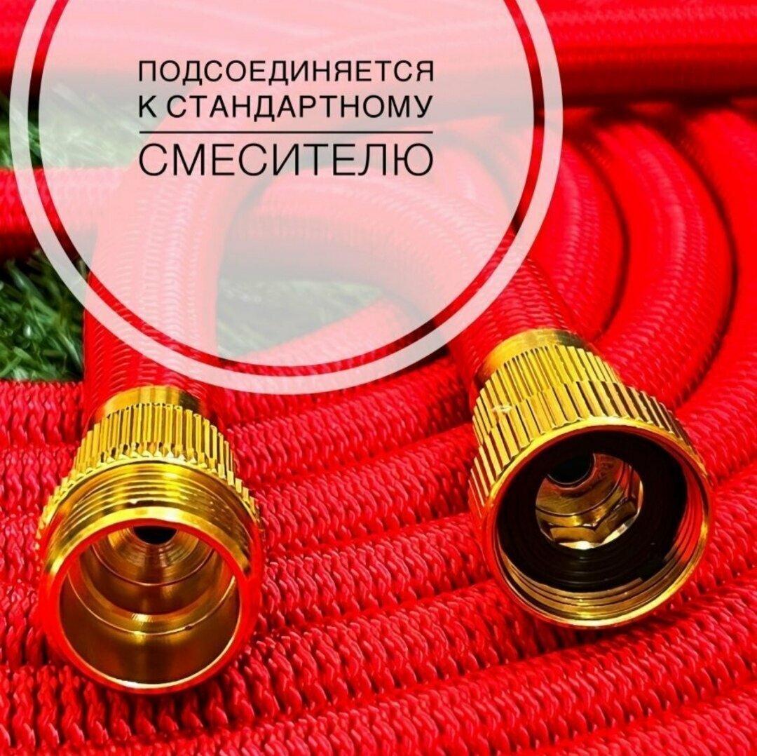 Шланг садовый растягивающийся 50 метров для полива с распылителем с быстросъемом/ 50 метров красный с металлическим соединением, быстросъём