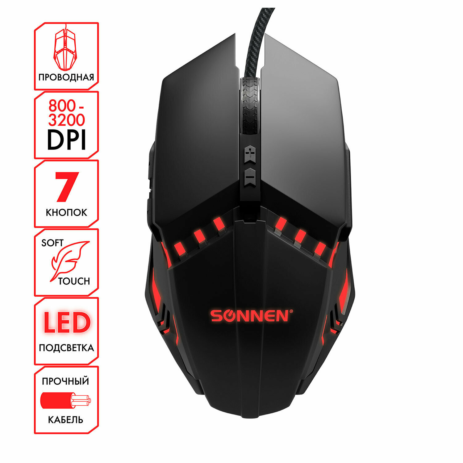 Мышь проводная игровая SONNEN Z5, металл/пластик, 7 кнопок, 800-3200 dpi, RGB-подсветка, черная, 513521 В комплекте: 1шт.