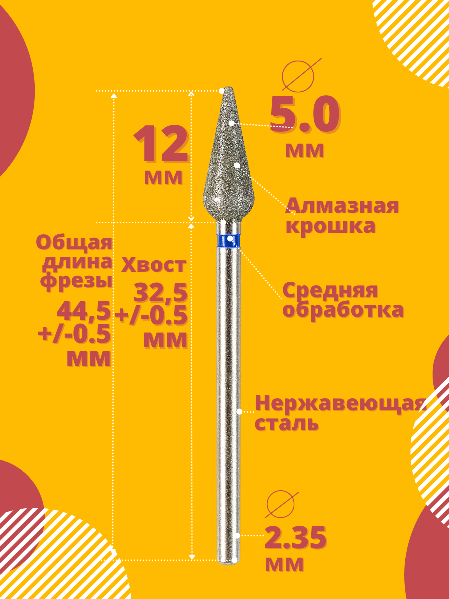 Фреза Astial "Морковка" (Почка Конус Капля) для маникюра и педикюра алмазная, 5 мм, синяя насечка , 10 штук