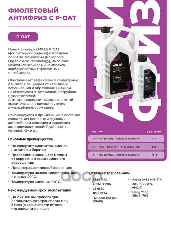 MILES AFPR001 Антифриз готовый к применение (фиолетовый) 1 кг P-OAT (фосфатно-лобридный) (SUPER LONG LIFE COOLANT -40C) AFPR001