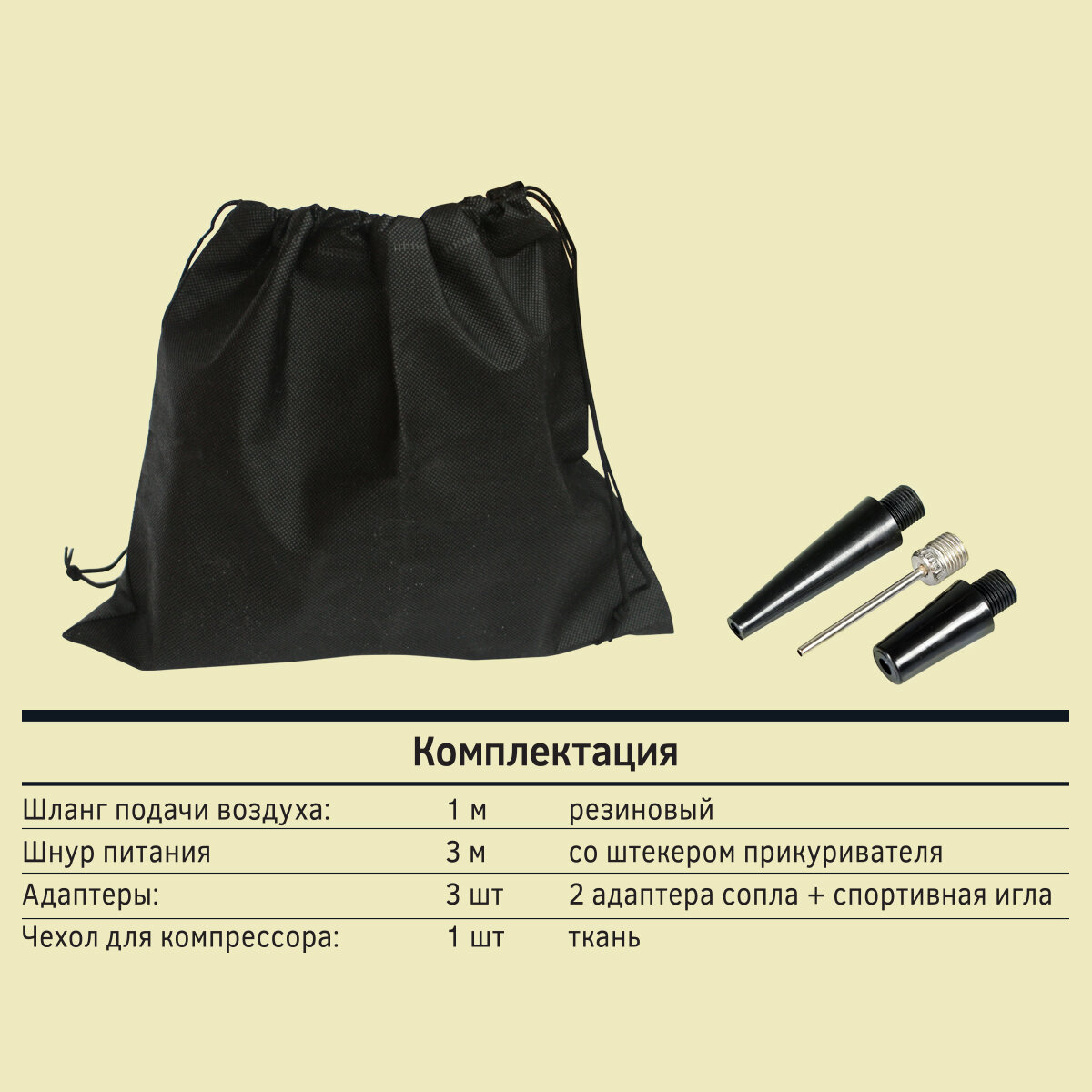 | В наборе | комплект насадок / переходник для велосипедных шин / переходник для лодок / переходник для мячей / сумка для хранения |