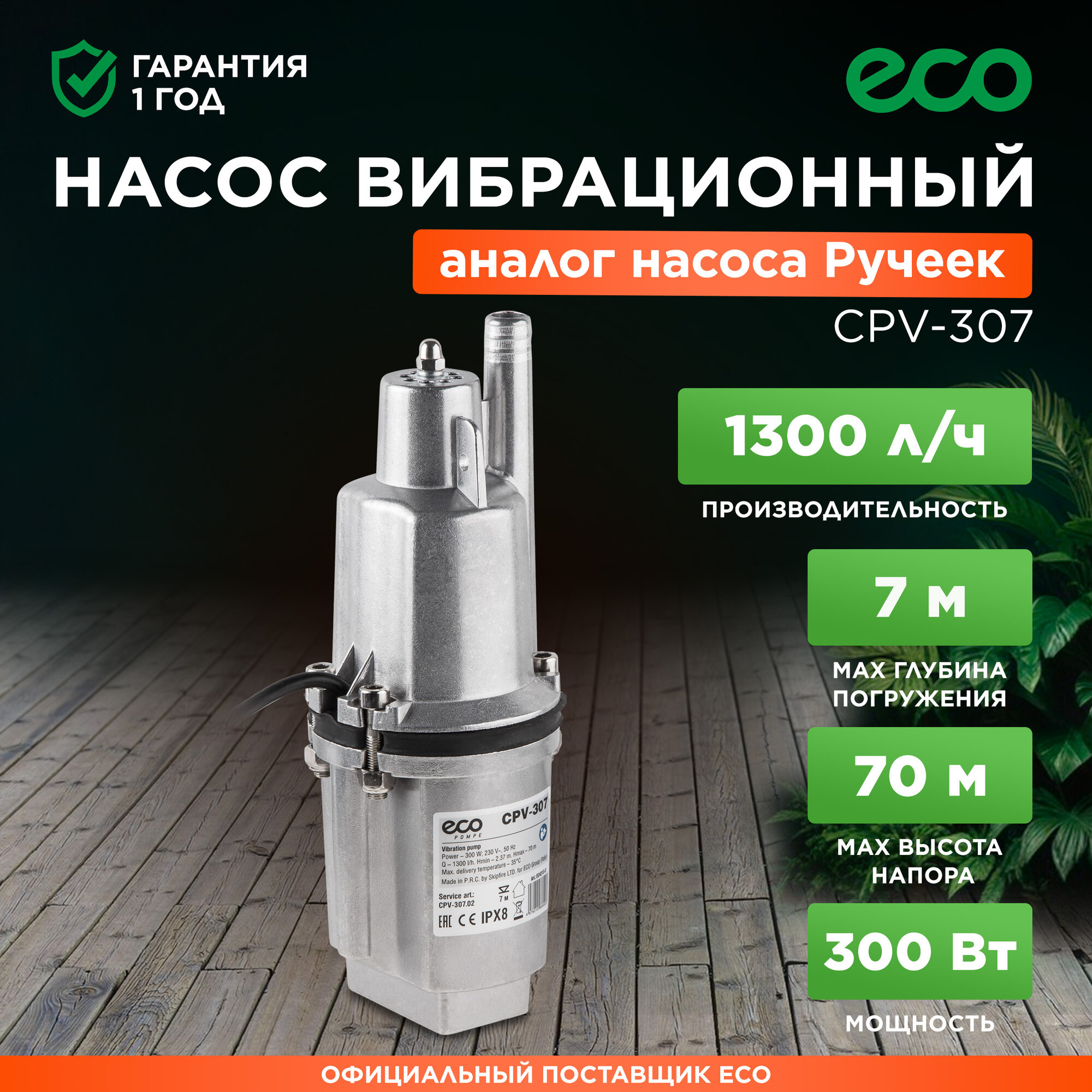 Насос вибрационный ECO CPV-307 (300Вт, 1300 л/ч, с питающ. пров. 10м, верх.забор воды, аналог насоса Ручеек) (EC4213-2)