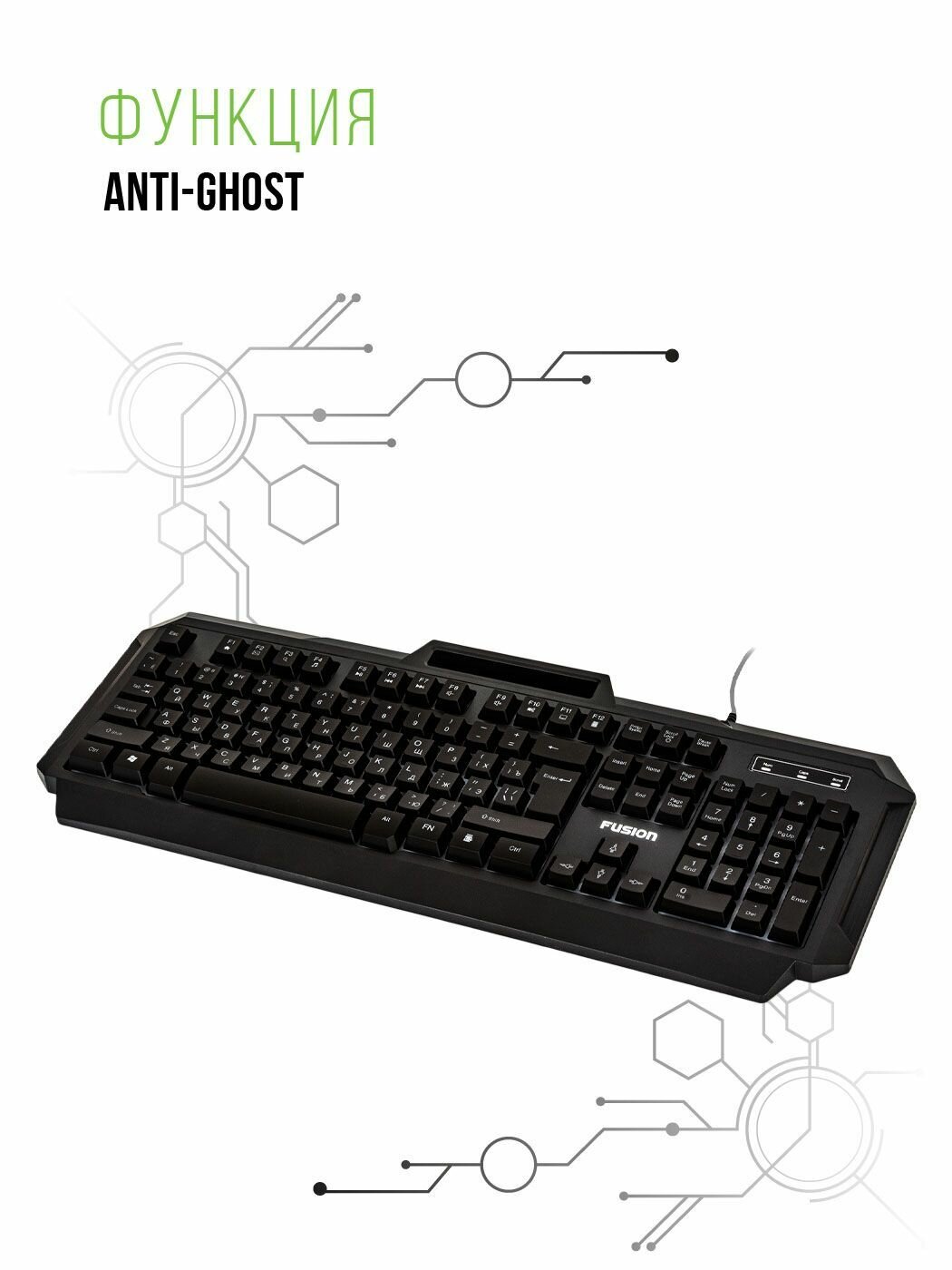 Клавиатура игровая FUSION мембранная, проводная с подставкой под телефон, функция Anti-ghost, 104 клавиши