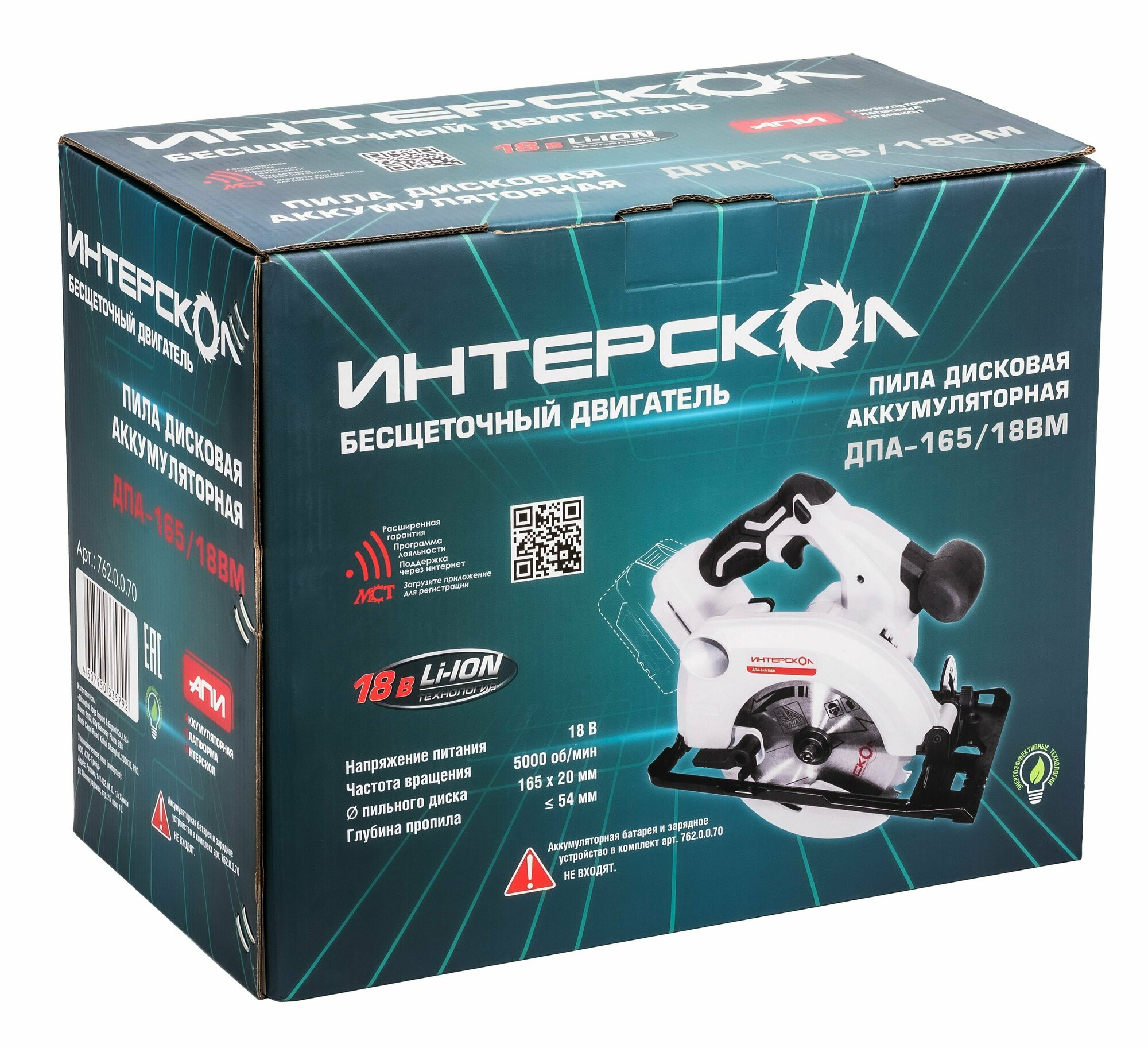 Аккумуляторная бесщеточная дисковая пила ИНТЕРСКОЛ ДПА-165/18ВМ 762.0.0.70