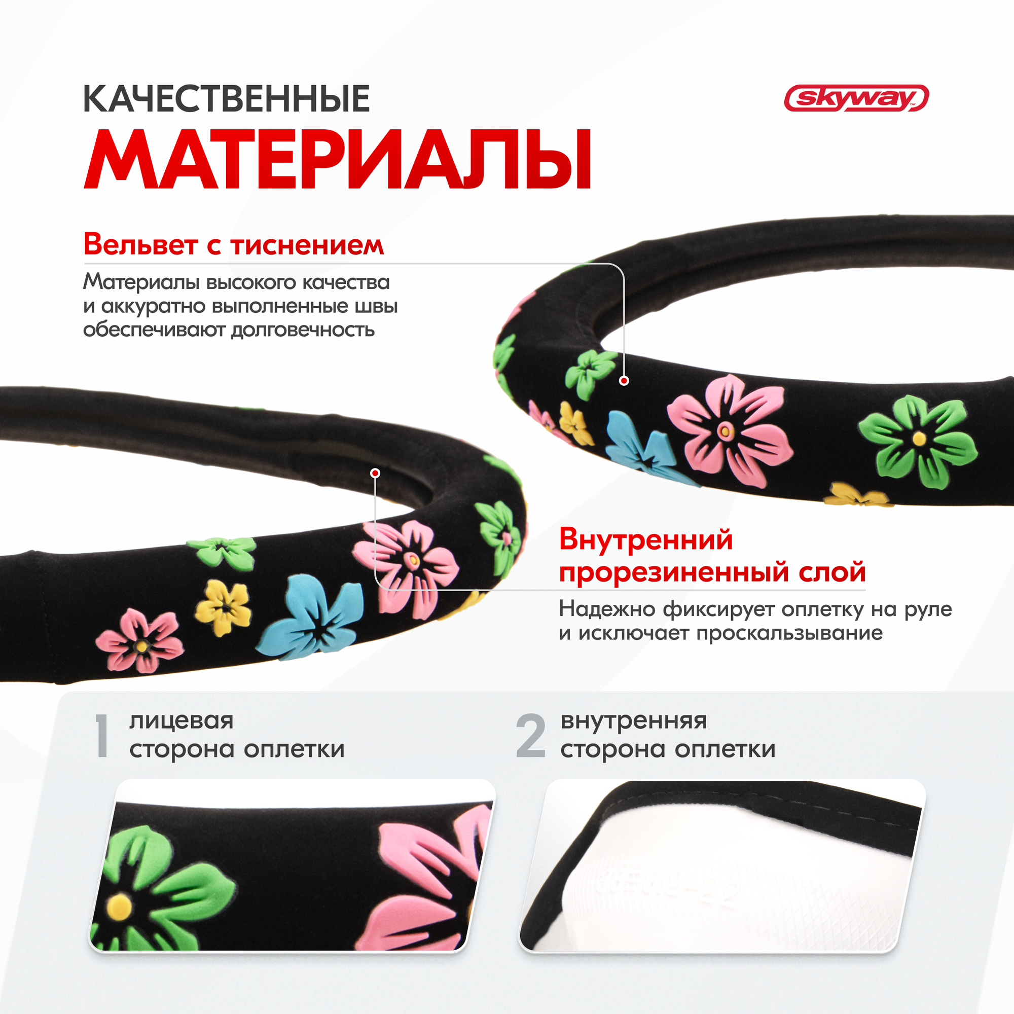 СохранитьSKYWAY Оплётка руля SKYWAY вельвет гладкая черная с рисунком "Цветы" ECO (M) интересное:
