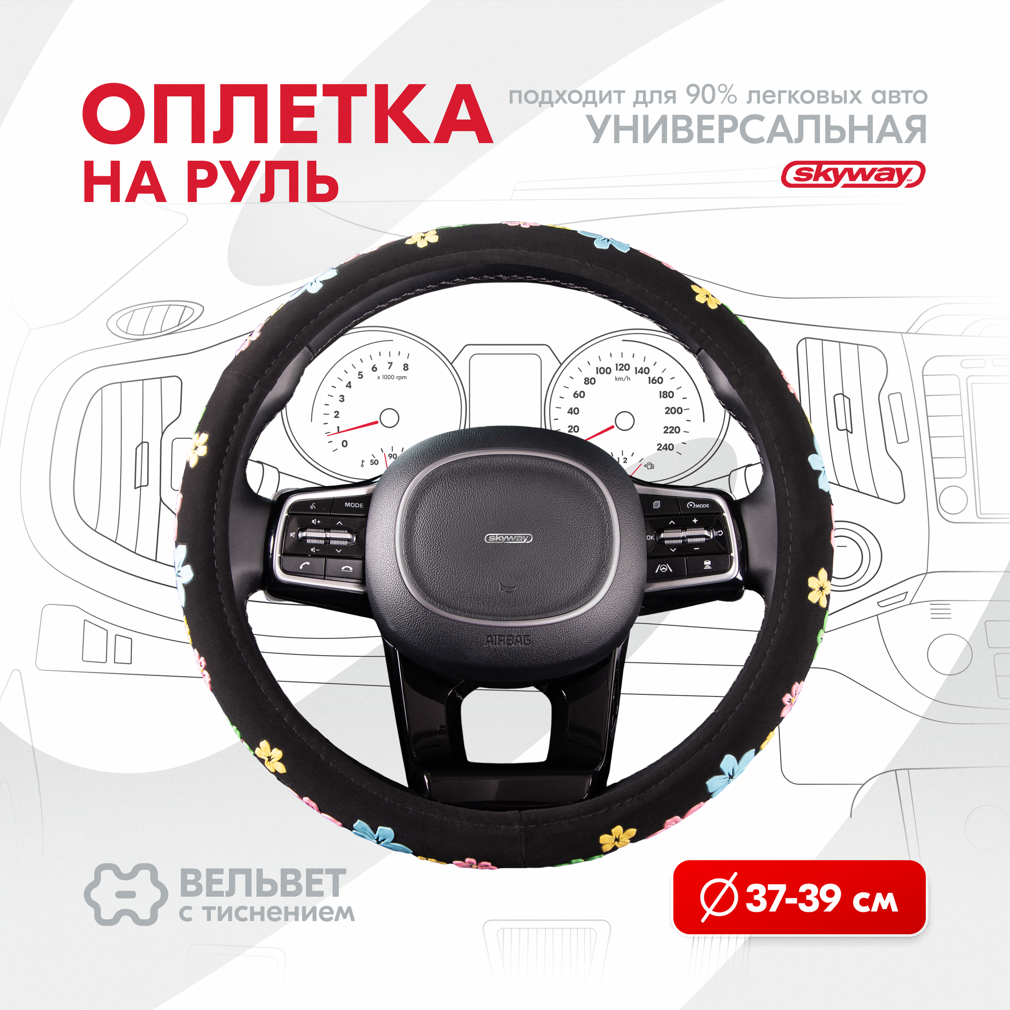 Купить SKYWAY Оплётка руля SKYWAY вельвет гладкая черная с рисунком "Цветы" ECO (M)