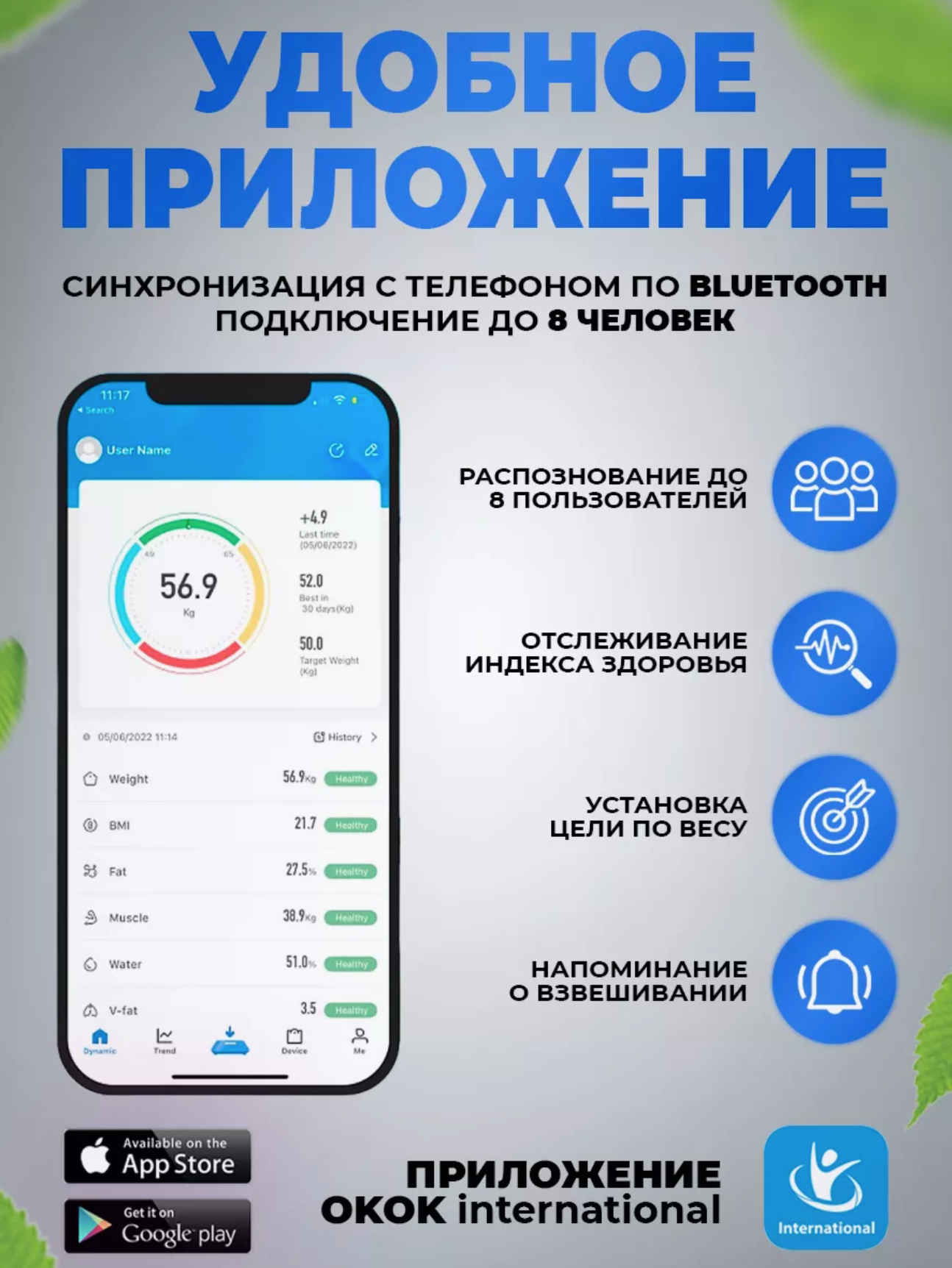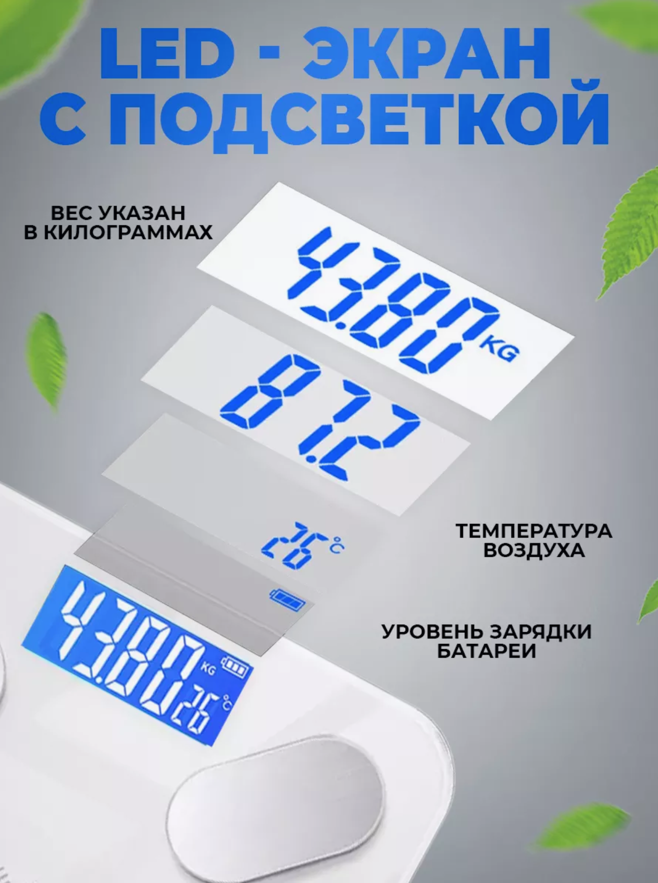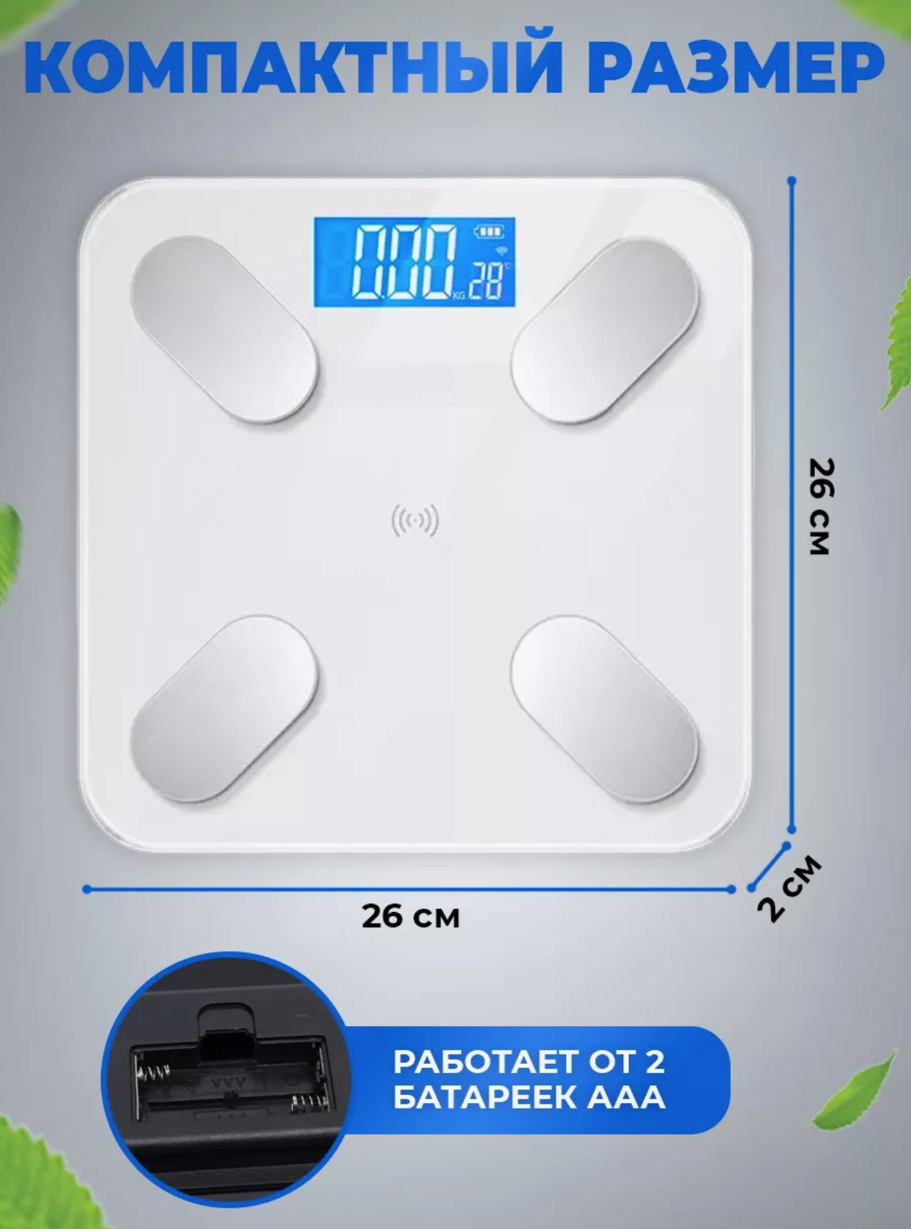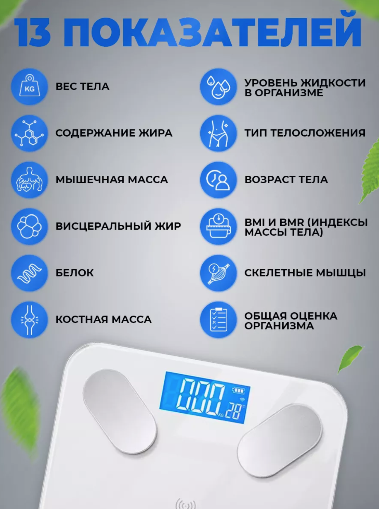 Напольные умные весы с расчётом 12 показателей качества тела совместимые для Android, IOS белые без рисунка интересное: