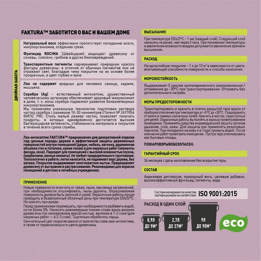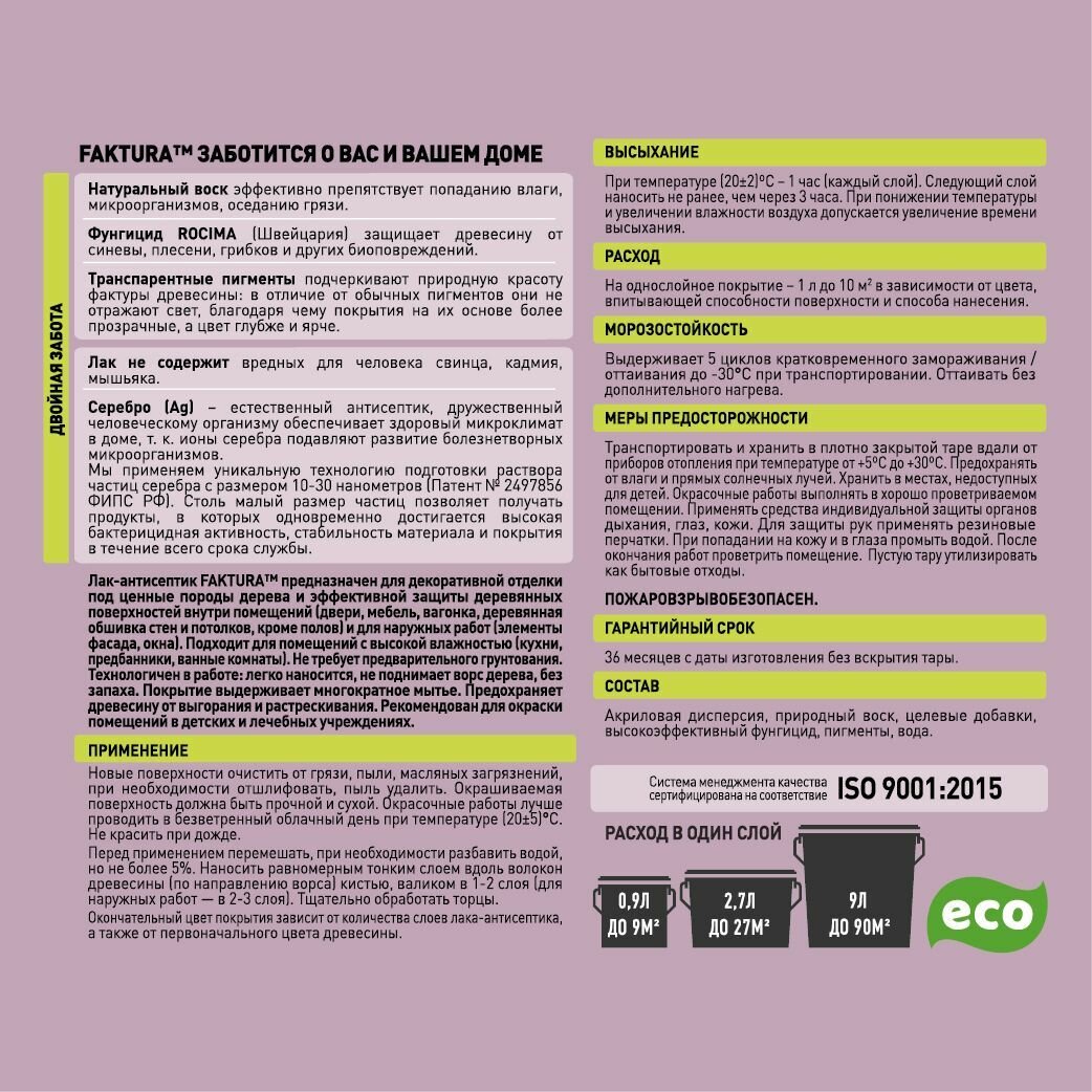 Лак Антисептик Faktura 0.9л Сосна, на Водной Основе с Ионами Серебра и Воском для Наружных и Внутренних Работ / Фактура.