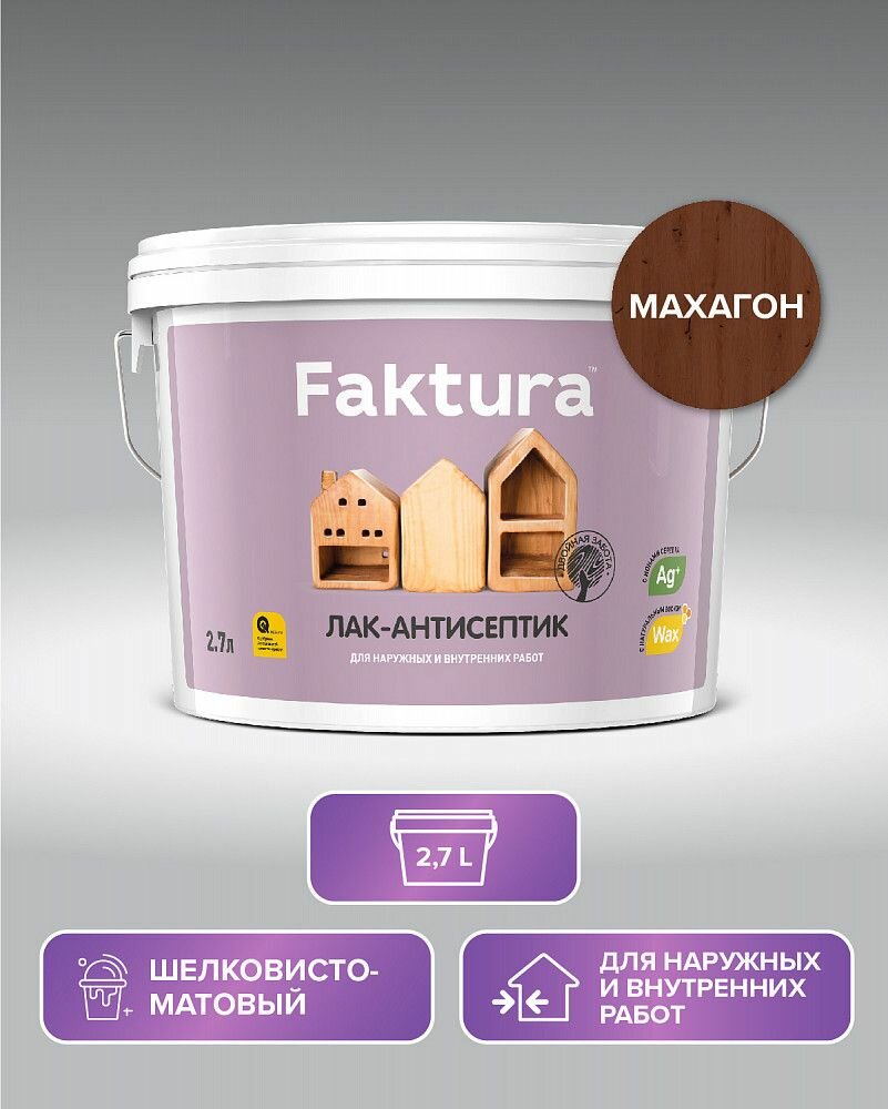 Лак Антисептик Faktura 0.9л Махагон, на Водной Основе с Ионами Серебра и Воском для Наружных и Внутренних Работ / Фактура.
